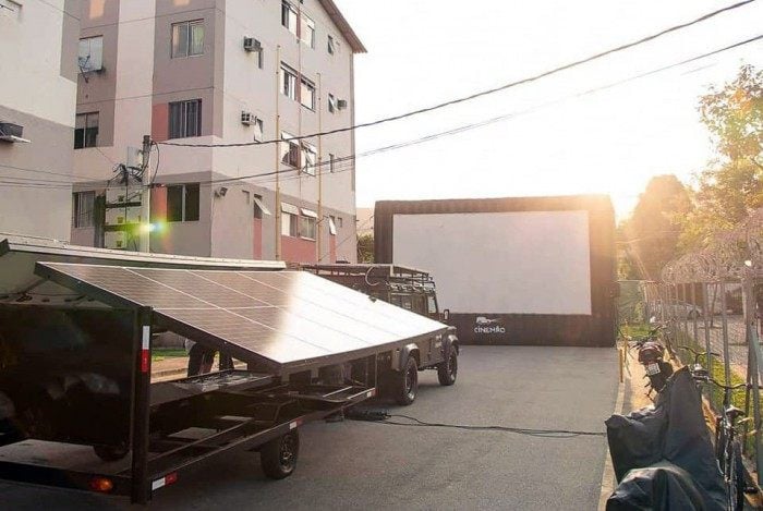 O Cinemão agora é solar. É o primeiro cinema movido 100% a energia solar do Estado do Rio. Desenvolvemos um inédito gerador fotovoltaico que abastece todo nosso sistema de projeção de filmes, através de painéis solares, conjunto de baterias de lítio e inversor de carga super potente, transportado em carreta reboque. É nós da ZO lançando outra "novidade nova".