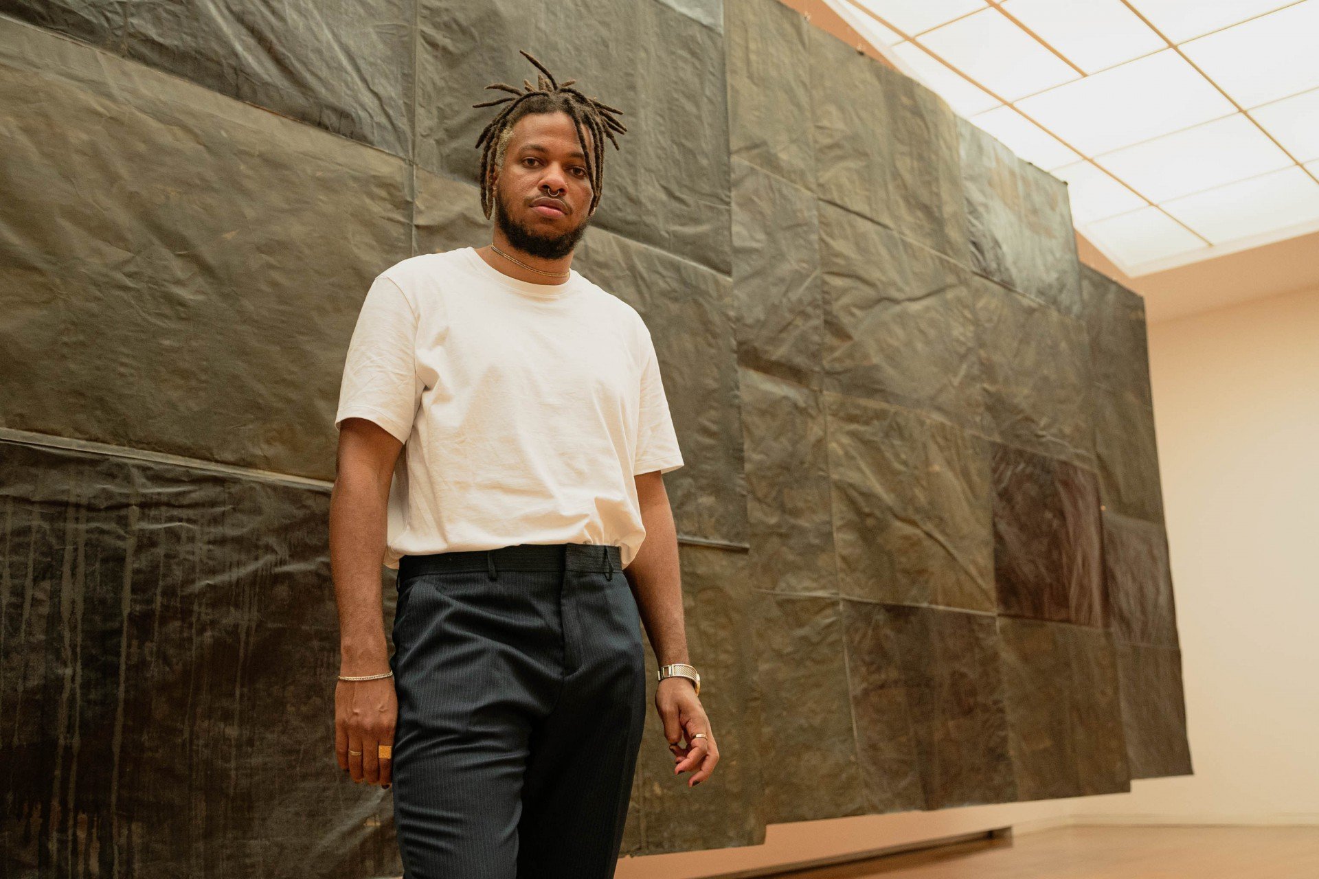 "Esses temas eram pouco tratados nas artes plásticas antes de mim, principalmente em pintura, com tanta sofisticação poética e sutileza. A pintura é uma mídia religiosa e muito tradicional, uma plataforma muito respeitada e influente, e tem sido a mídia principal de minha prática. Então acaba que eu tenho esse veículo para projetar minhas ideias. É importante ter isso mapeado porque eu posso manipular muitas coisas a partir disso. Mas confesso que estou mais interessado, enquanto artista, nas contradições que a arte enquanto campo pode me oferecer, e em como eu posso colocar isso no mundo."