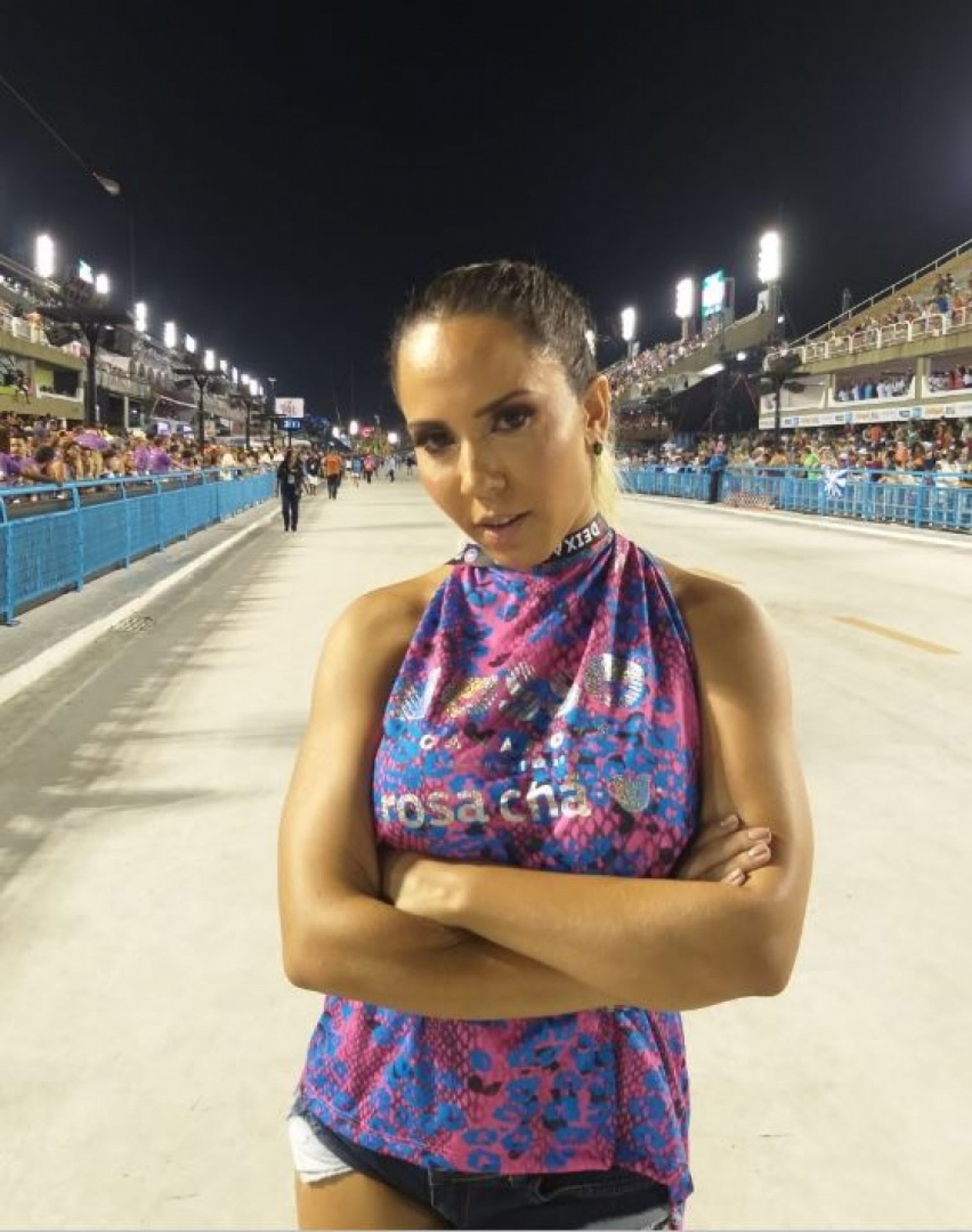 Renata Frisson, a Mulher Melão, esteve na Sapucaí neste sábado de Carnaval para assistir aos desfiles. E revelou ao Meia por que não mostrou os seios na folia deste ano: 'Não vai ter melão pelado na Sapucaí porque o Brasil tá em crise. Tô fazendo greve pra ver se a economia cresce".