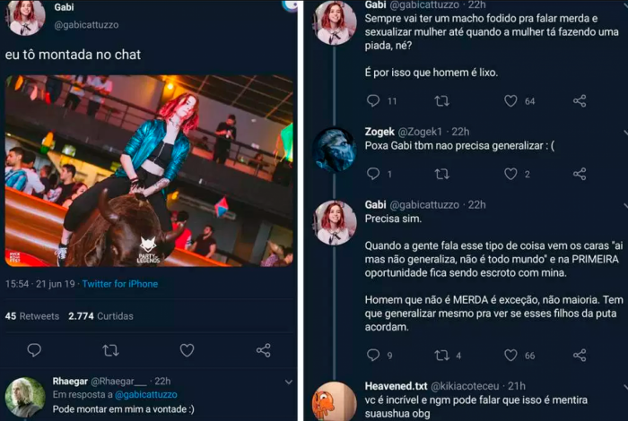 A influenciadora Gabi Catuzzo, conhecida por transmitir jogos na internet, se viu em meio a uma grande polêmica. Na última sexta-feira, a gamer postou uma foto em que estava montada em um touro mecânico e um dos seguidores respondeu com um comentário sexista.