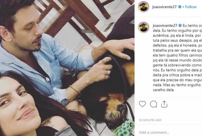 João Vicente ainda deixou claro que Cleo não precisa de seu reconhecimento para nada. "Eu tenho orgulho dela porque ela não deita pra crítica pobre e machista. Não que ela precise do meu orgulho pra nada. Mas eu tenho orgulho pra caral** dela", compartilhou em seu Instagram.