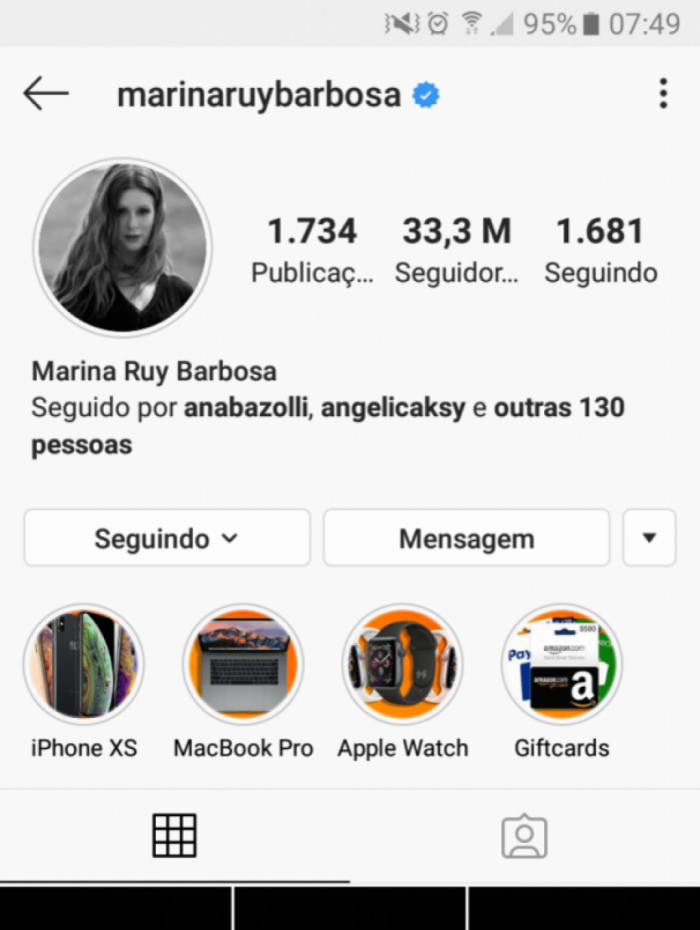 A atriz Marina Ruy Barbosa foi vítima de hackers na madrugada desta terça-feira. Com 33,3 milhões de seguidores no Instagram, o perfil da atriz começou a divulgar uma suspeita doação de iPhones e outros produtos da marca Apple. A biografia da atriz no Instagram exibia um link para a tal promoção.