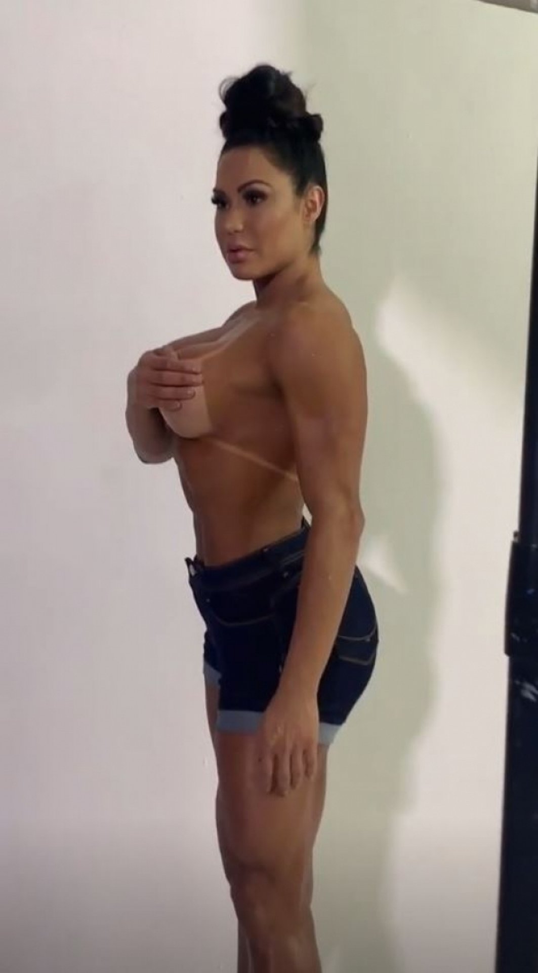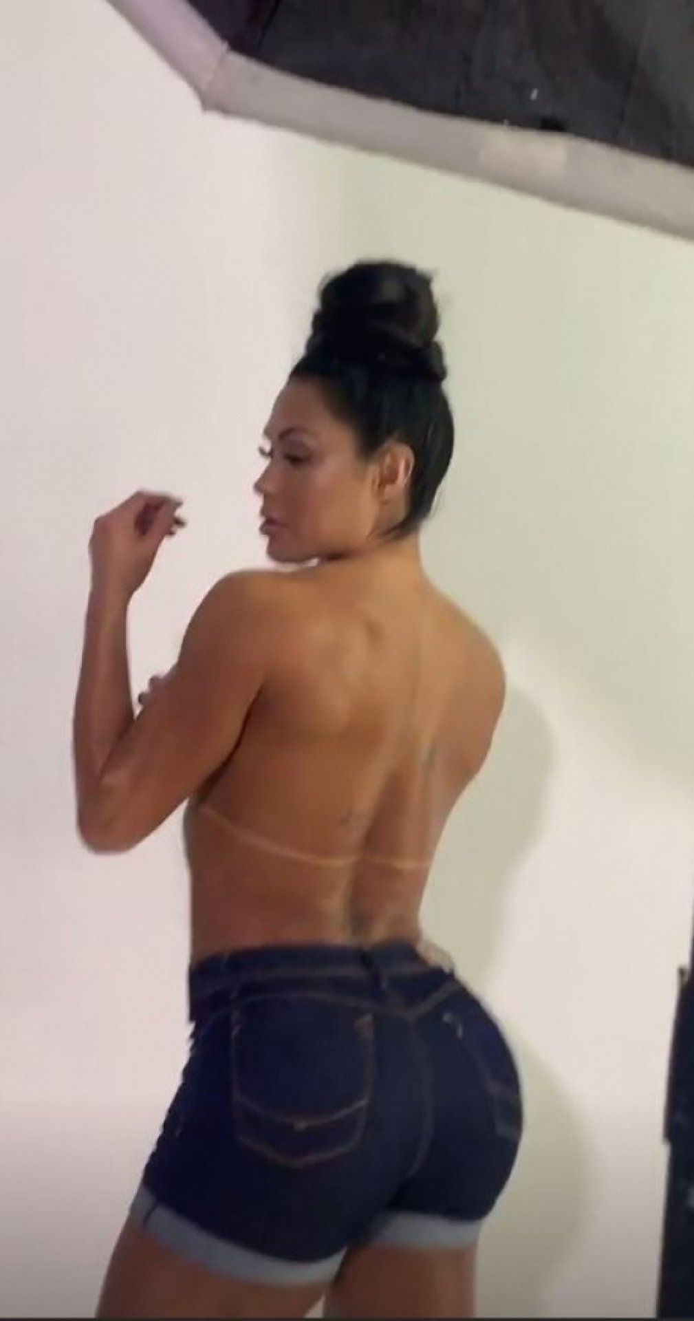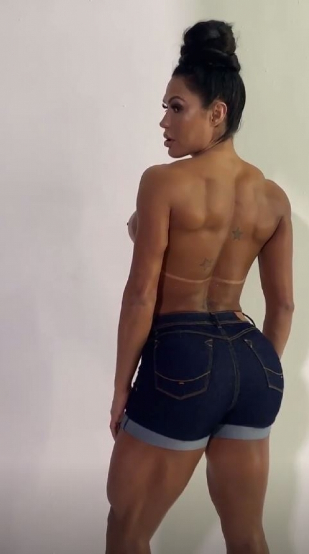 Gracyanne Barbosa compartilhou com os fãs alguns detalhes de um ensaio fotográfico realizado nesta quarta-feira. Em algumas fotos, a modelo posou somente de short jeans com a mão cobrindo os seios.