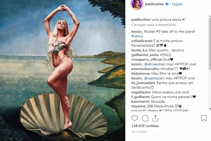 Na manhã desta segunda-feira, Pabllo Vittar publicou em seu Instagram uma foto em que ela aparece em uma pose como uma obra de arte. A montagem foi inspirada no quadro O Nascimento de Vênus, do pintor italiano Sandro Botticelli.