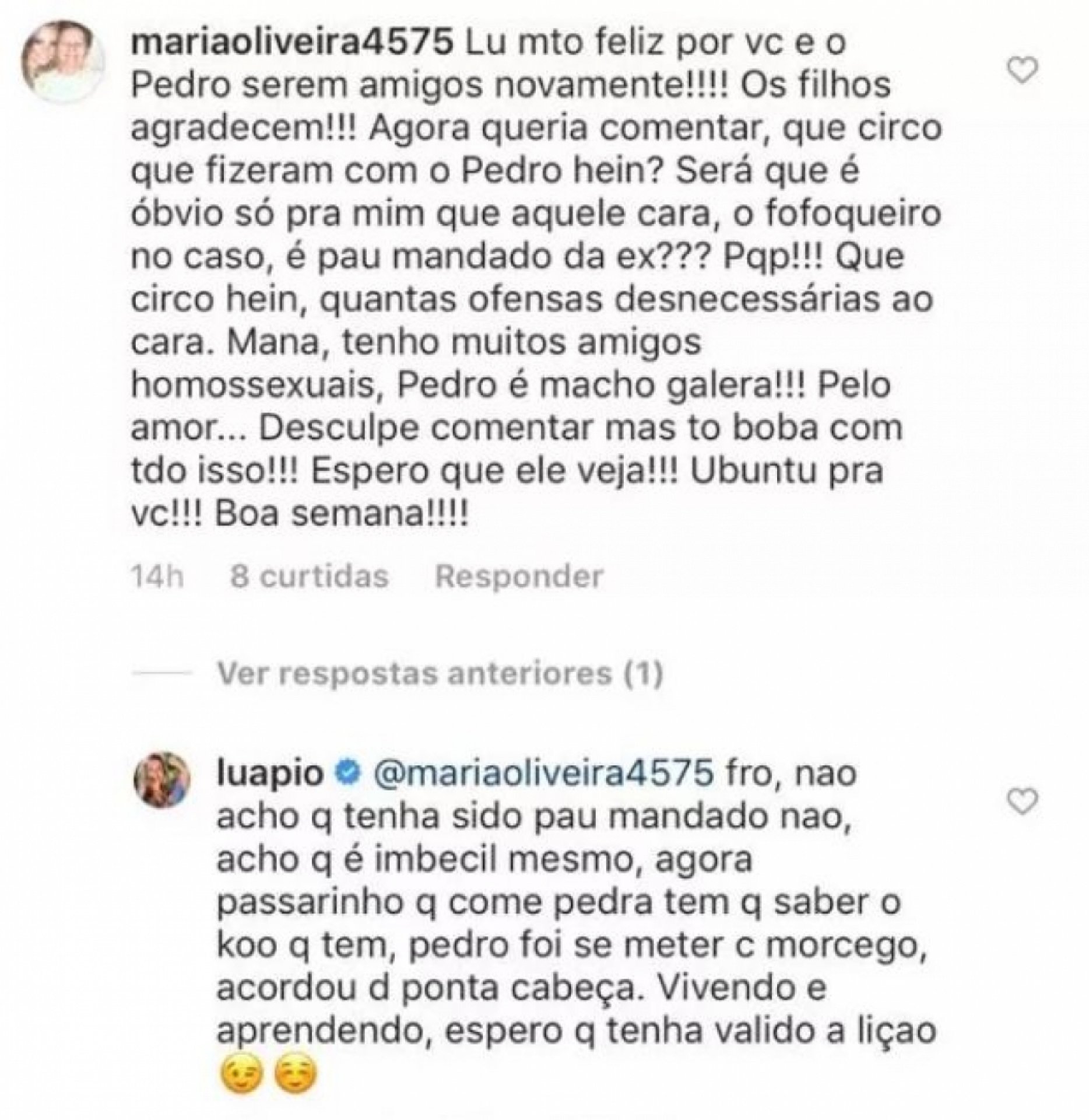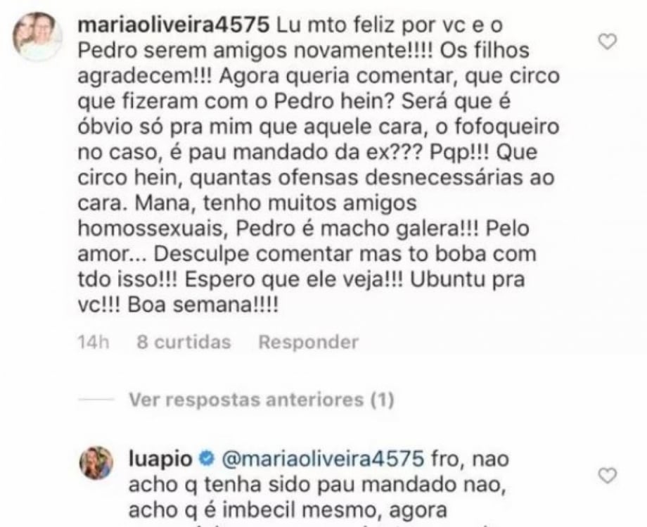"Lu, muito feliz por você e o Pedro serem amigos novamente! Os filhos agradecem! Agora, queria comentar, que circo que fizeram com o Pedro, hein? Será que é óbvio só para mim que aquele cara, o fofoqueiro no caso, é pau mandado da ex? Pqp! Que circo, hein, quantas ofensas desnecessárias ao cara. Mana, tenho muitos amigos homossexuais, Pedro é macho, galera! Pelo amor... Desculpe comentar, mas to boba com tudo isso! Espero que ele veja! Ubuntu pra você! Boa semana!", escreveu.