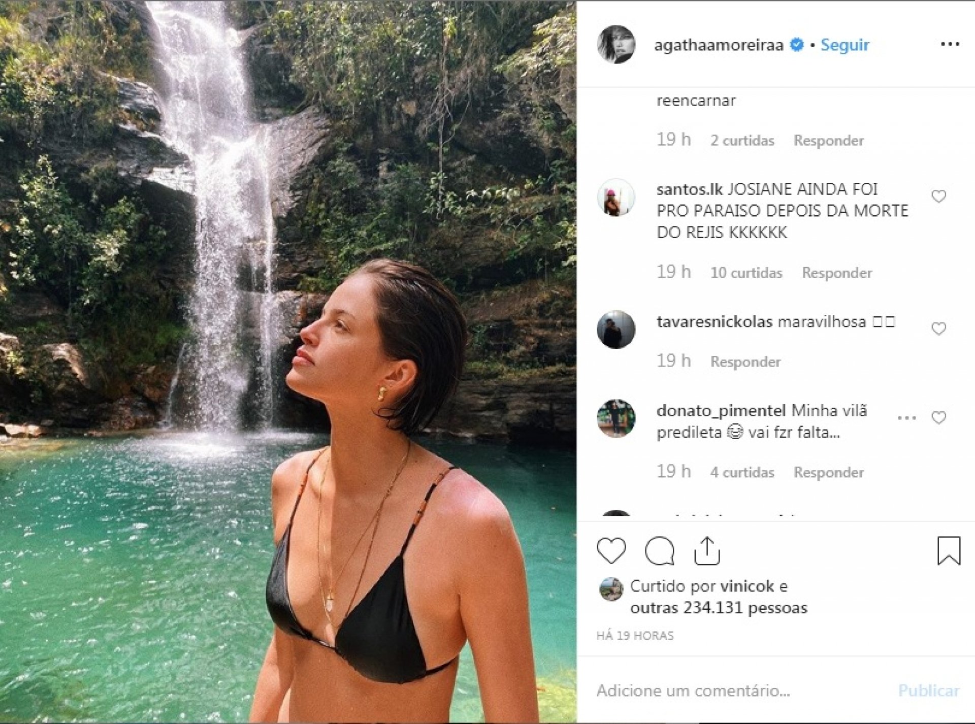 "A Dona do Pedaço" saiu do ar, mas não saiu da cabeça dos telespectadores. Isso porque a atriz Agatha Moreira que deu vida a vilã Josiane, postou uma foto curtindo suas férias na cachoeira e os seguidores lotaram os comentários com brincadeiras sobre a personagem.