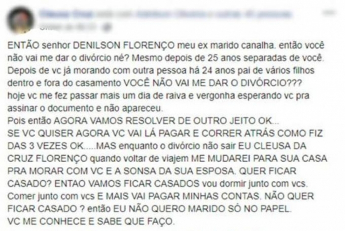 A história de uma mulher de 51 anos que prometeu se mudar para casa do ex-marido caso ele não assinasse o divórcio foi a sensação do mês de maio. Cleusa desabafou sobre Denilson, com quem foi casada e prometeu que se mudaria de “mala e cuia” para onde ele vivia com outra companheira há 25 anos caso ele não assinasse os papéis.
