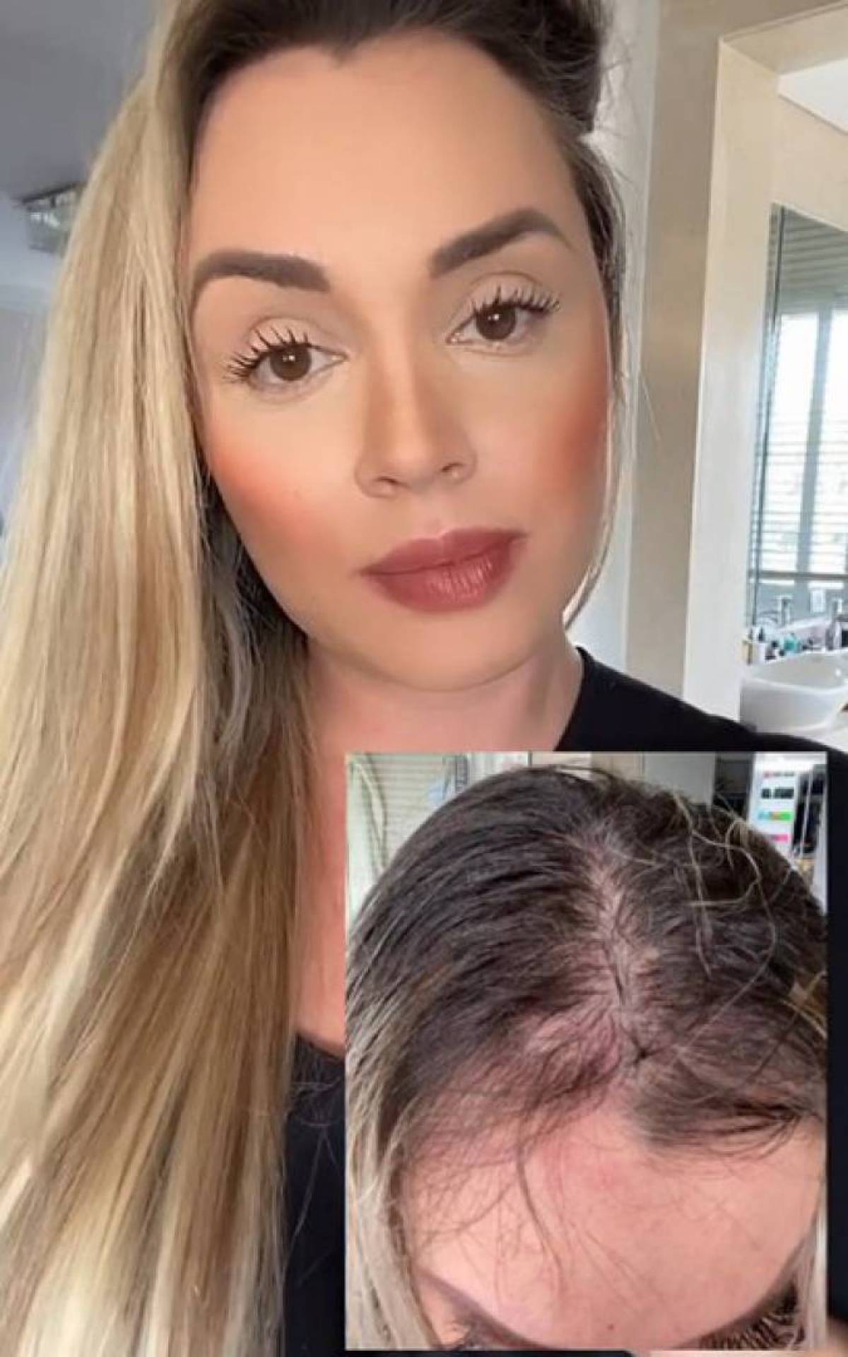 “Depois de muito tempo, me sinto confortável para mostrar e para falar. Seguinte, em 2018, já falei várias vezes para vocês que eu passei por uma queda de cabelo imensa, desesperadora, por causa de problemas emocionais, depressão. Toda essa minha parte de cima do cabelo caiu. Caía em mechas”, começou contando Juju Salimeni.