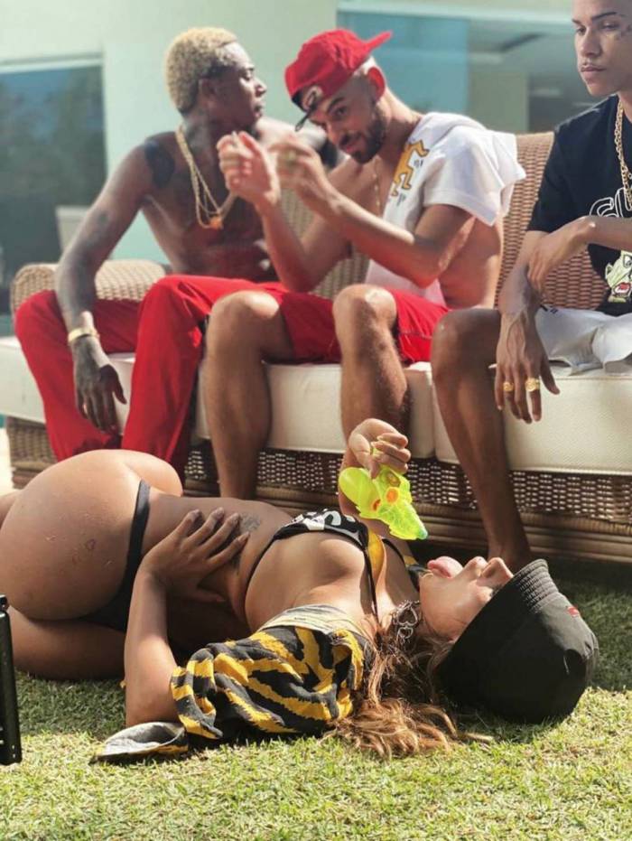 Nas imagens, a cantora aparece no chão de sua casa, de biquíni, exibindo suas curvas. "Prepara que essa ai ta pesada! @papatinho @dfideliz @souobin ... geral #TaComOpapato", escreveu a cantora na legenda das fotos.