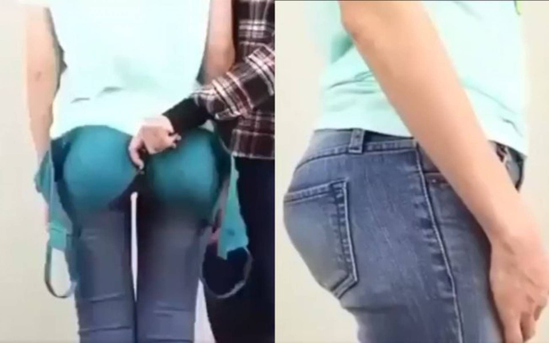"Coloque um sutiã cuidadosamente na sua bunda, debaixo da sua calça jeans. Uau, o bojo está fazendo o trabalho dele! Engole essa, Kim Kardashian!", a mulher fala no vídeo.