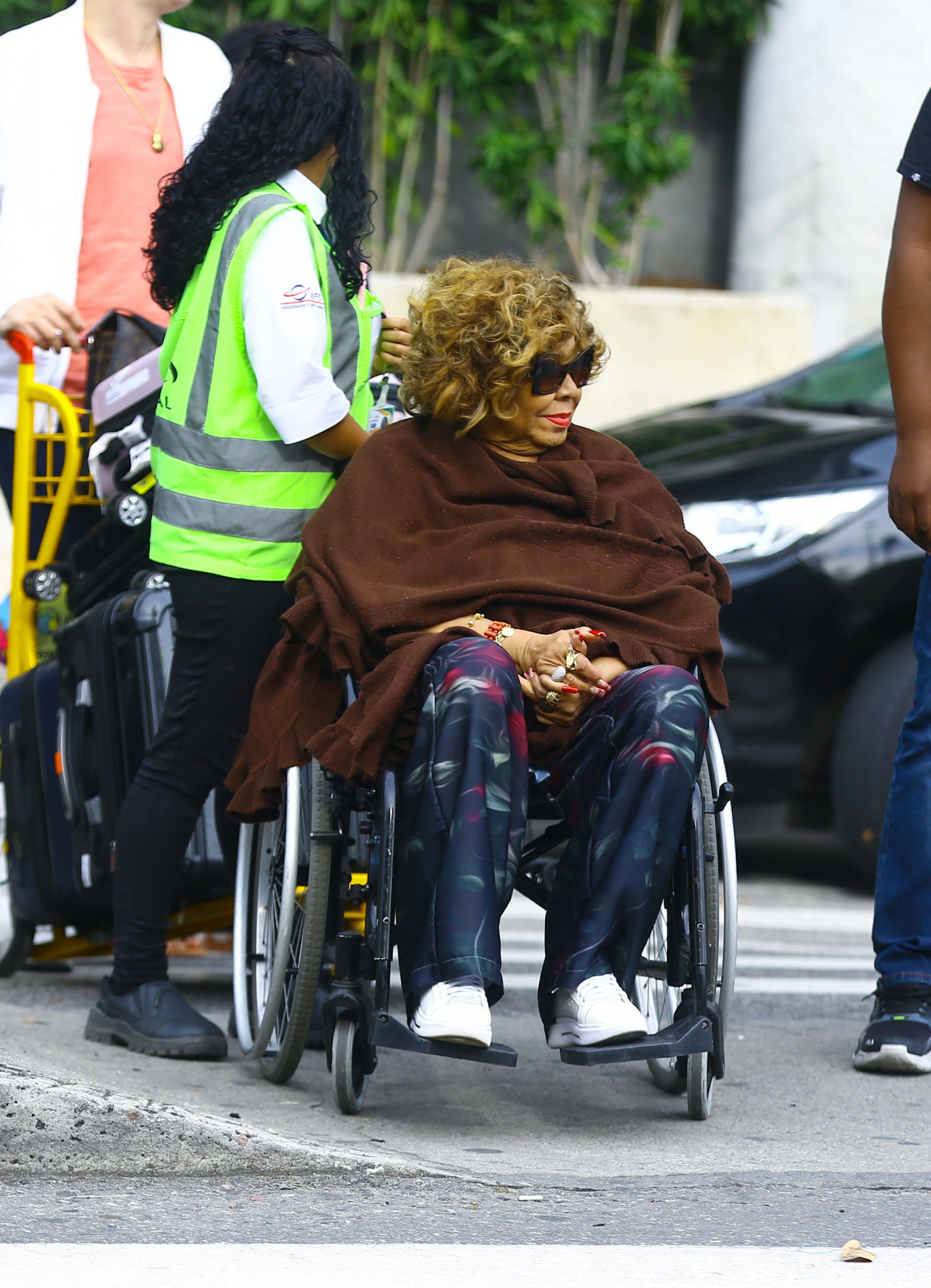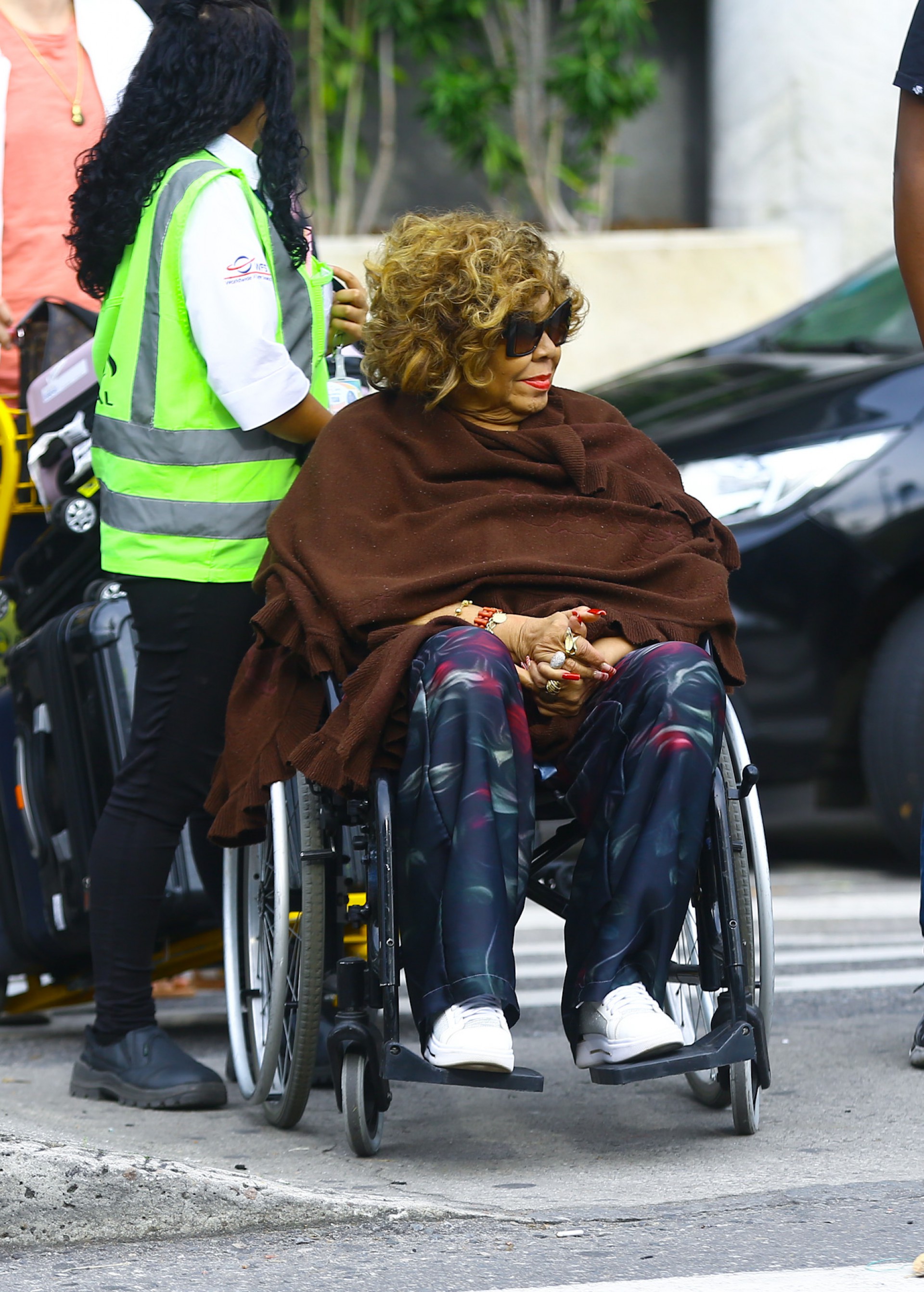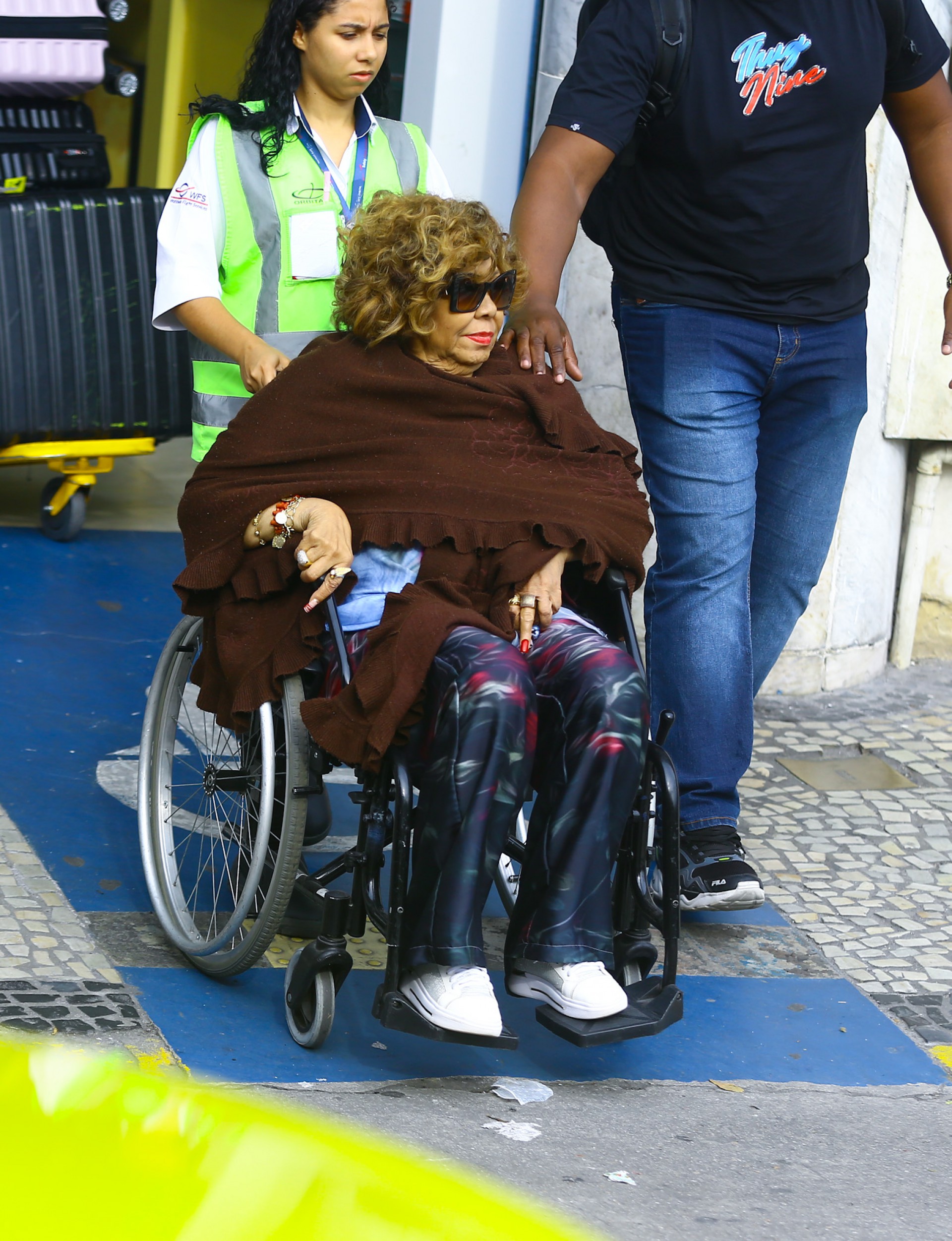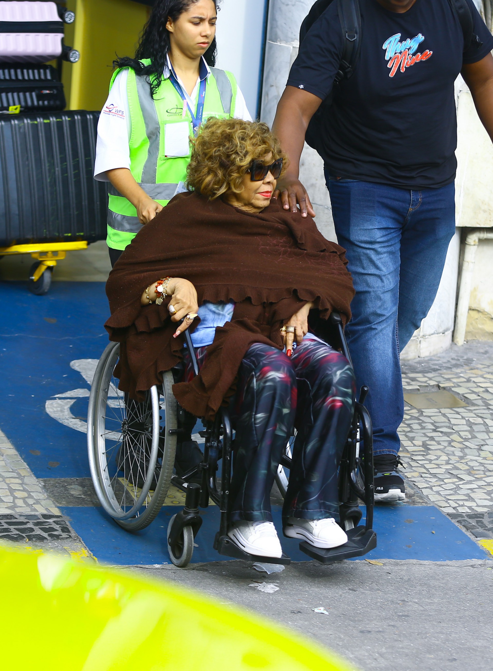 Alcione, de 74 anos, desembarcou no aeroporto Santos Dumont, no Rio, neste domingo. A cantora, que completa 50 anos de carreira este ano, estava em uma cadeira de rodas e recebeu o auxílio de uma funcionária do local. Na ocasião, a sambista mostrou muito estilo.