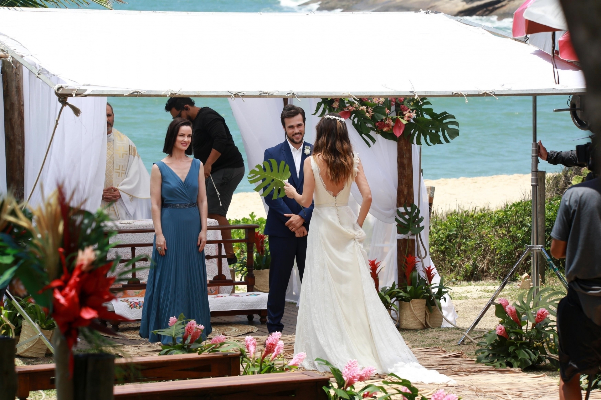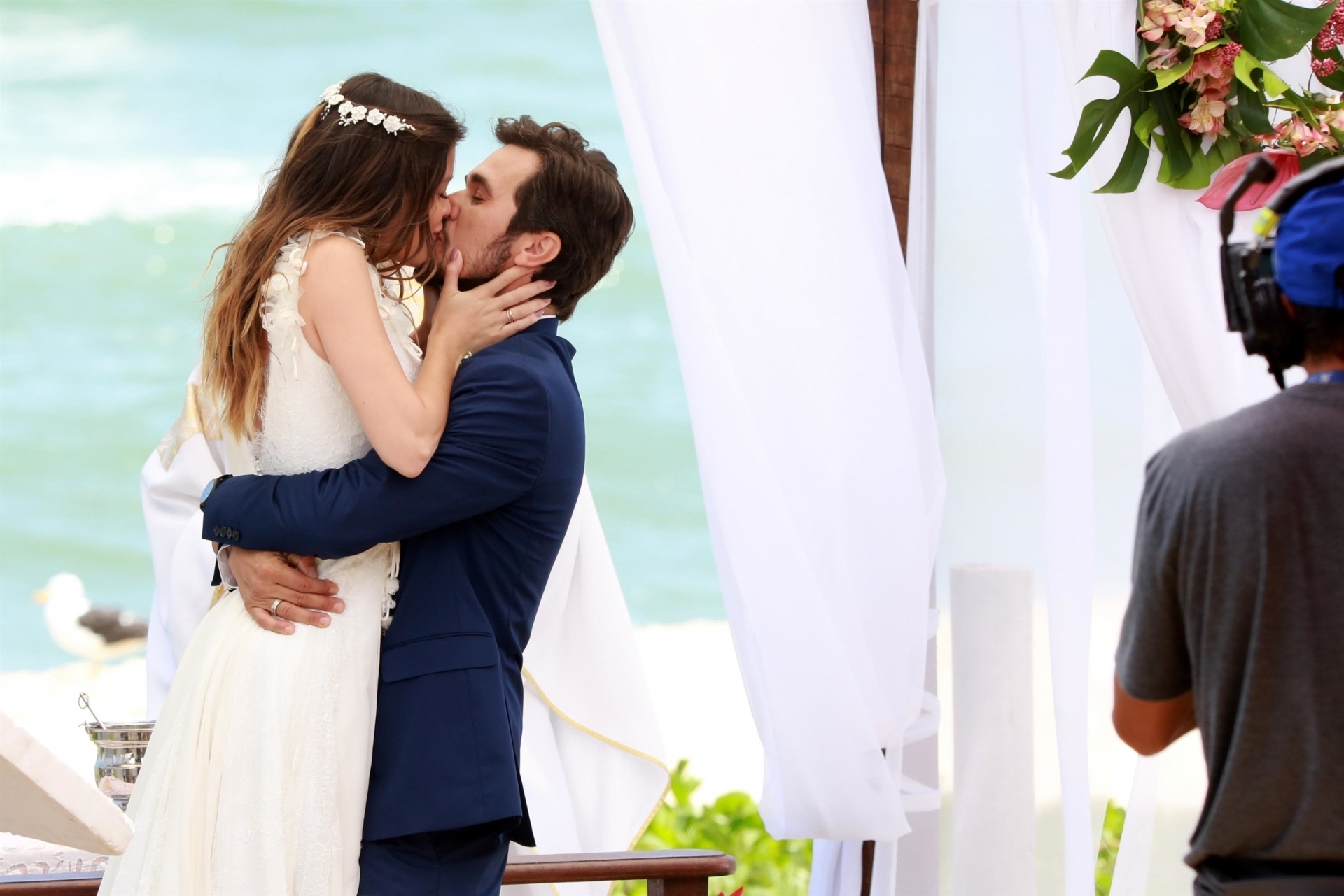 Vitória Strada, Carolina Kasting e Bruno Ferrari começaram a gravar Salve-se Quem Puder, próxima novela das 19h da Globo, prevista para estrear em janeiro. Os atores foram fotografados na praia de Grumari, na Zona Oeste do Rio, gravando uma cena de casamento, ontem.