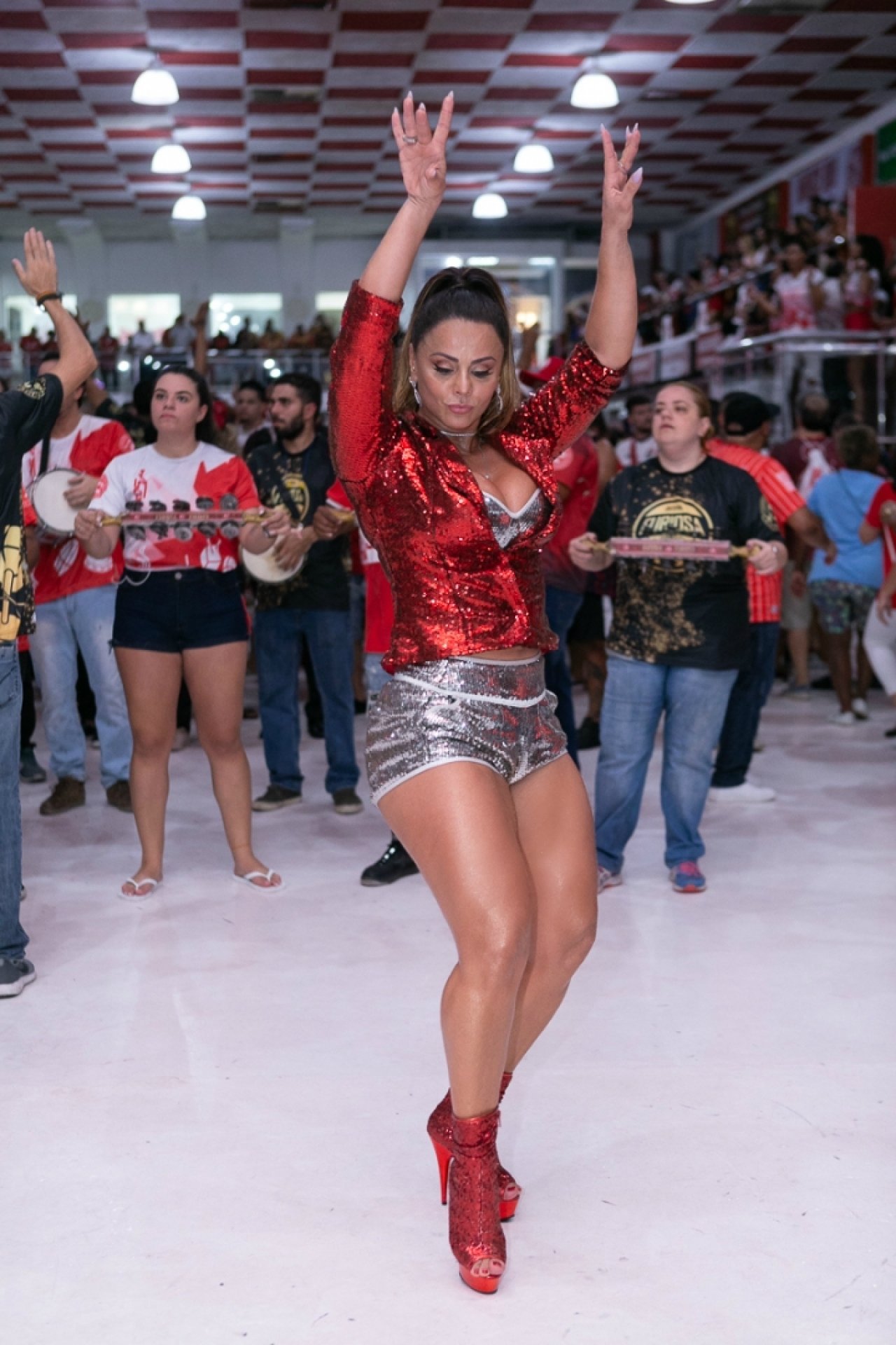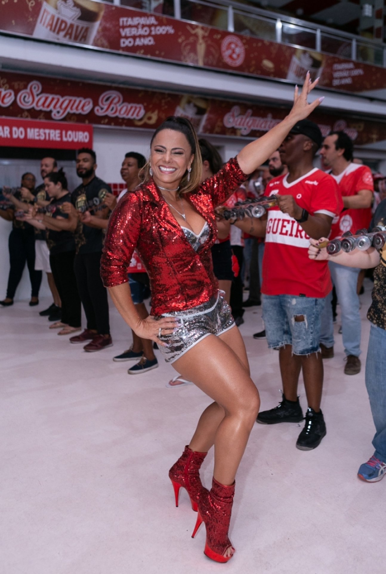 Rainha de Bateria do Salgueiro, Viviane Araújo marcou presença no ensaio, que aconteceu na quadra da agremiação, na noite de quinta-feira. Na ocasião, a atriz esbanjou simpatia e samba no pé. A coreografia teve direito até a uma empinadinha no bumbum.