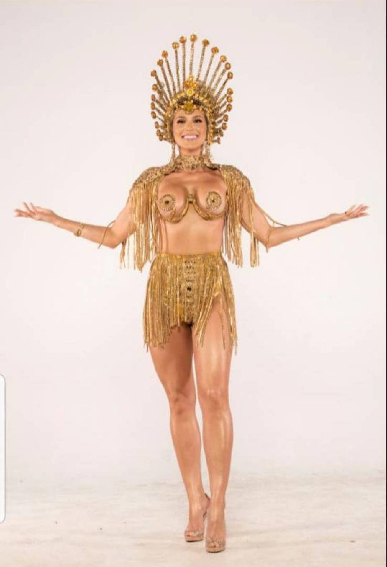 Sobre a fantasia, estou seguindo o que o carnavalesco desenhou para mim. Acho que é uma fantasia bem tradicional de bateria. Achei na medida. Nem tão pelada, nem tão vestida!