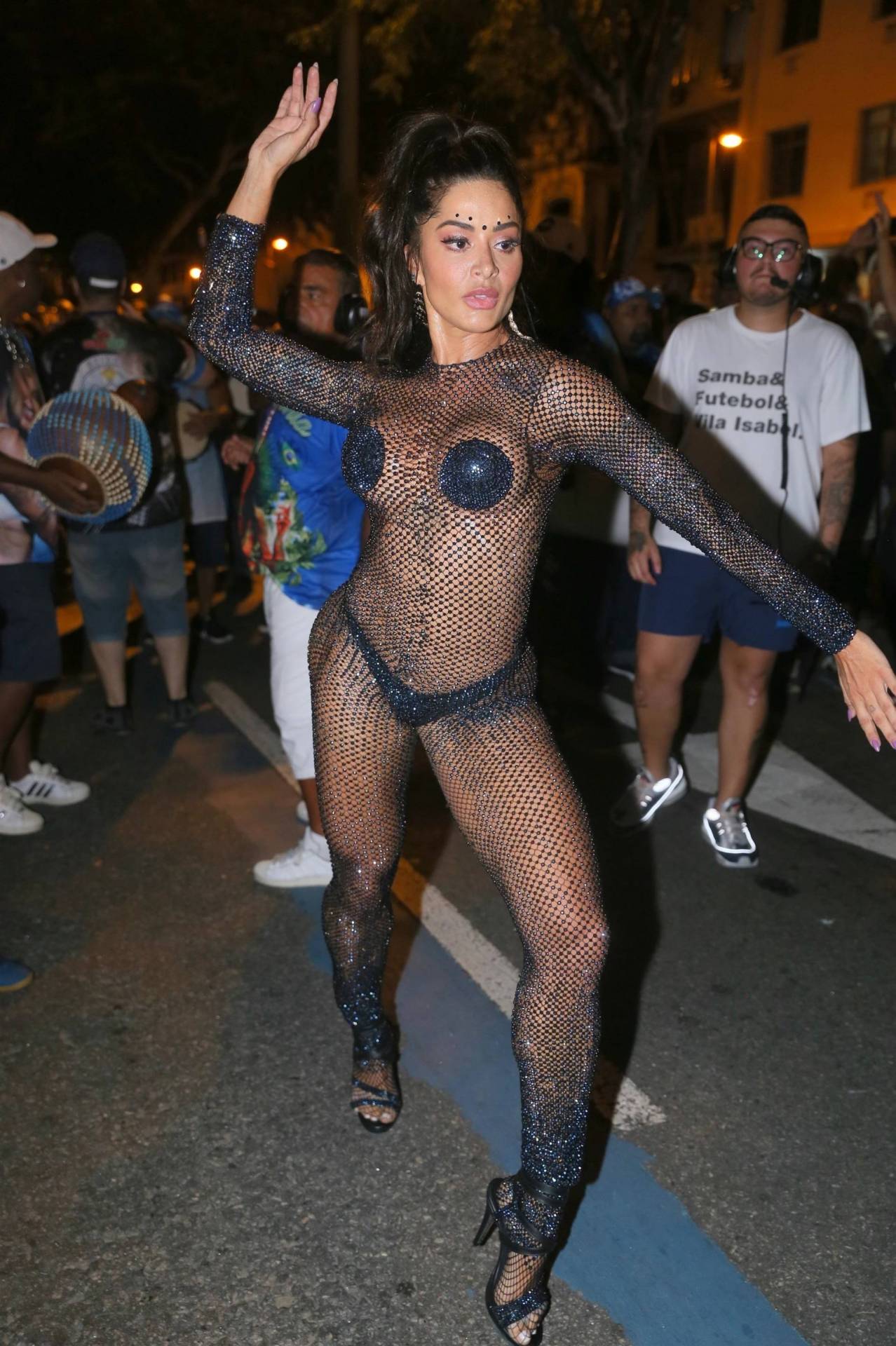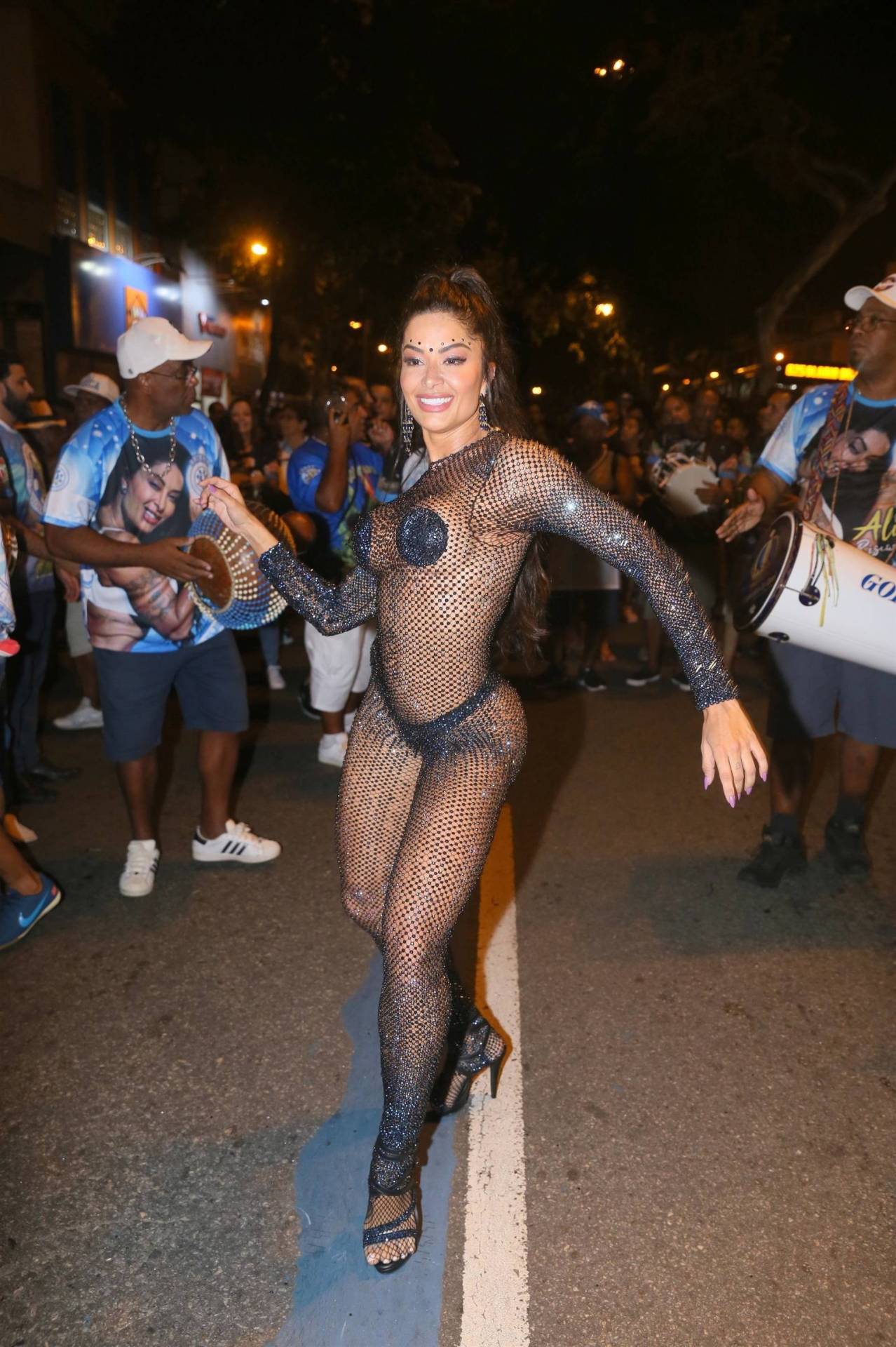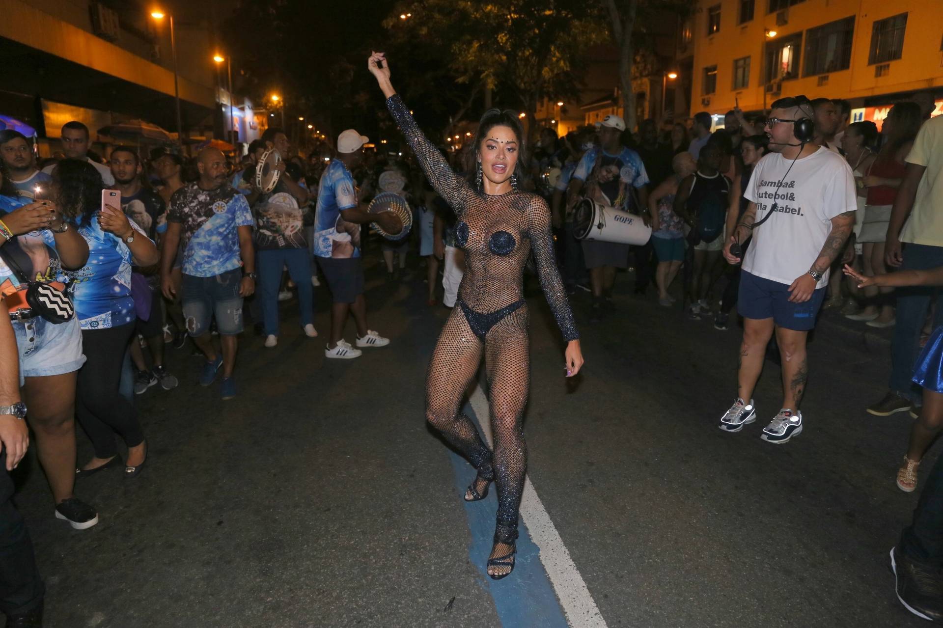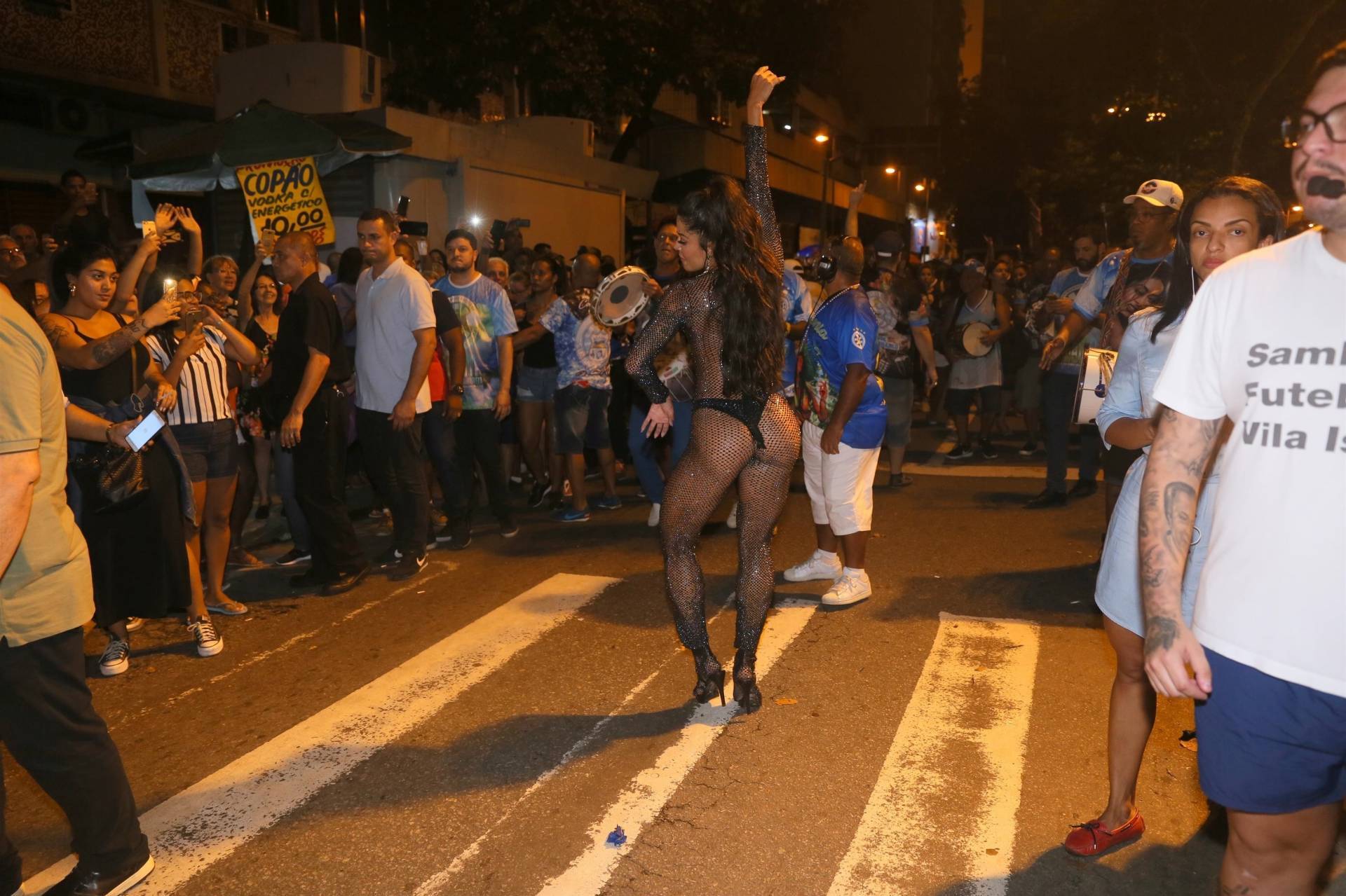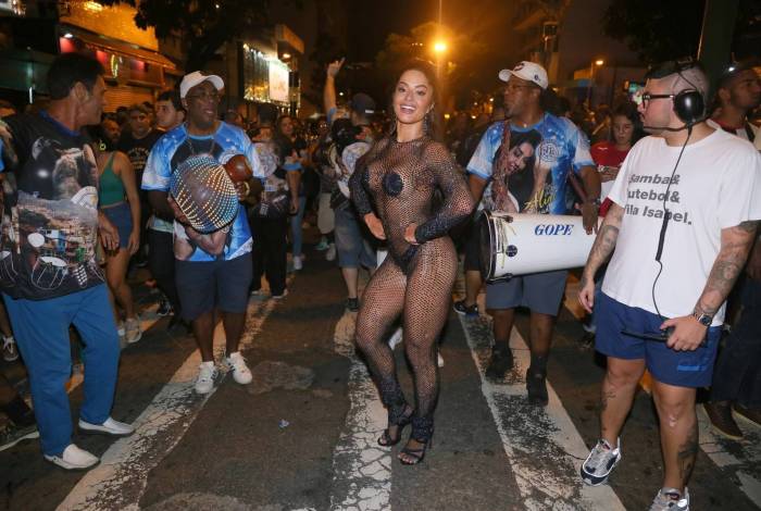 Rainha de Bateria da Vila Isabel, Aline Riscado, escolheu um look pra lá de ousado para o ensaio de rua da agremiação, na noite de quinta-feira. Com um adesivo nos seios, calcinha fio-dental e cavada, e um macacão bem vazado, a atriz e bailarina atraiu todos os olhares devido à sua boa forma. Ela, claro, também mostrou todo o seu samba no pé e simpatia.