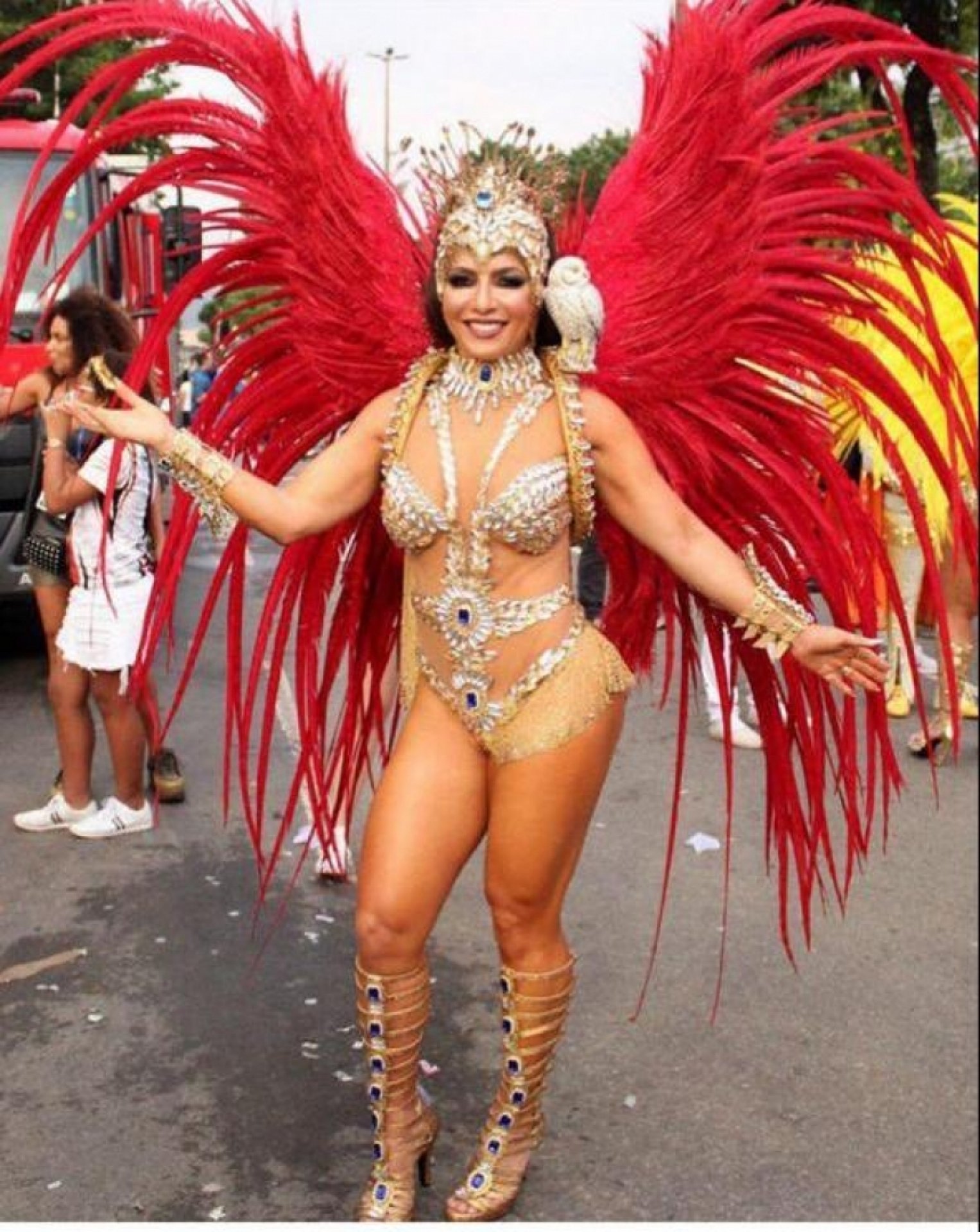 Na Unidos da Tijuca, Mônica Barbosa estava vestida de Atenas, deusa da sabedoria. A fantasia dela foi assinada por Guilherme Alves.