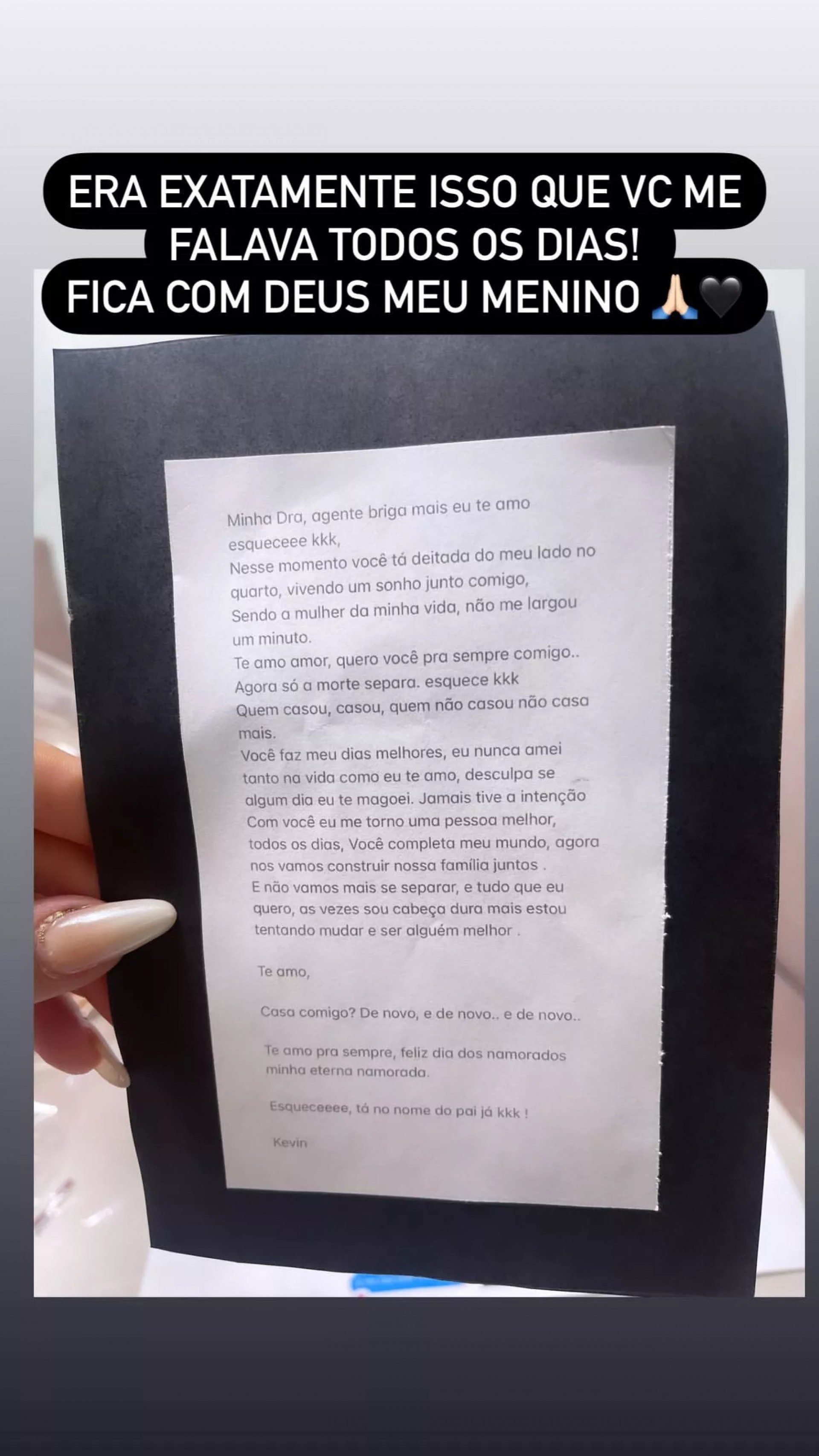 Continuou: “Você faz meus dias melhores, eu nunca amei tanto na vida como eu te amo. Desculpa se algum dia eu te magoei, eu jamais tive a intenção. Com você eu me torno uma pessoa melhor todos os dias, você completa meu mundo. Agora nós vamos construir uma família juntos e não vamos mais se separar. Às vezes, sou cabeça dura, mas estou tentando mudar e ser alguém melhor. Te amo, casa comigo de novo e de novo? Te amo para sempre, feliz Dia os Namorados minha eterna namorada”, finalizou.