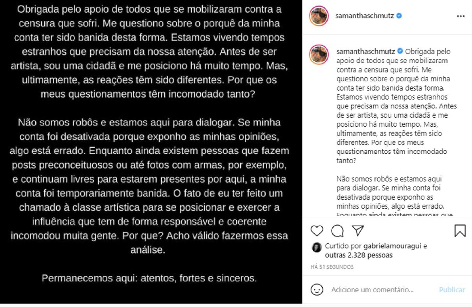 Após inúmeros protestos contra a censura, a conta da atriz foi reativada e ao anunciar a volta, às 18 horas, ela fez um apelo a seus seguidores: "Não vamos calar, combinado?!".