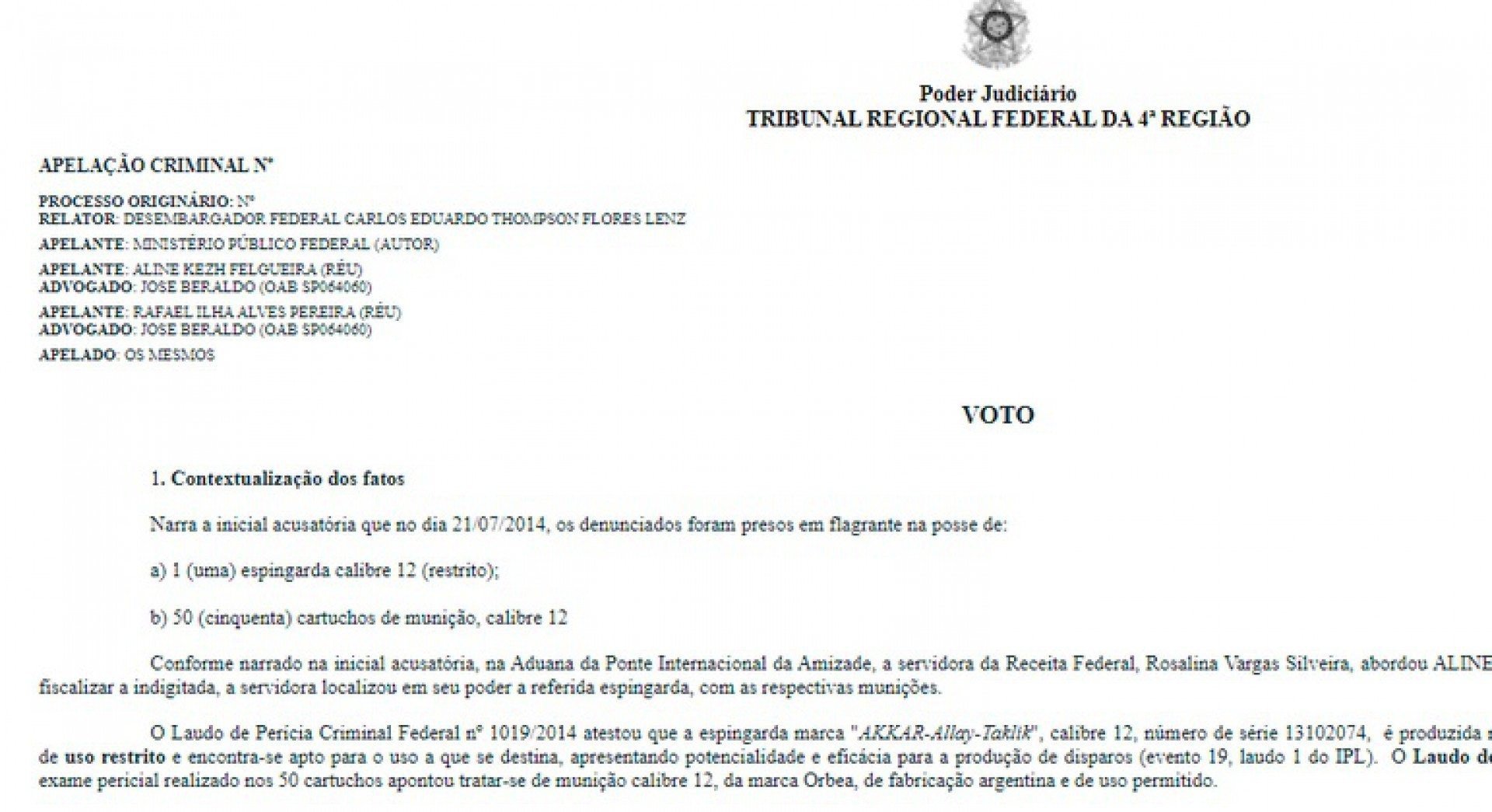 "A autoria delitiva é inequívoca, recaindo sobre os réus, pois os mesmos confessaram que a arma e as munições foram encontradas em poder de Aline Kezh Felgueira (a ré), enquanto o réu Rafael Ilha Alves Pereira, na mesma circunstância de tempo e lugar, apresentou-se como sendo o proprietário e responsável pelos objetos ilícitos apreendidos", informou no processo o Desembargador federal Carlos Eduardo Thompson Flores Lenz, relator do caso.