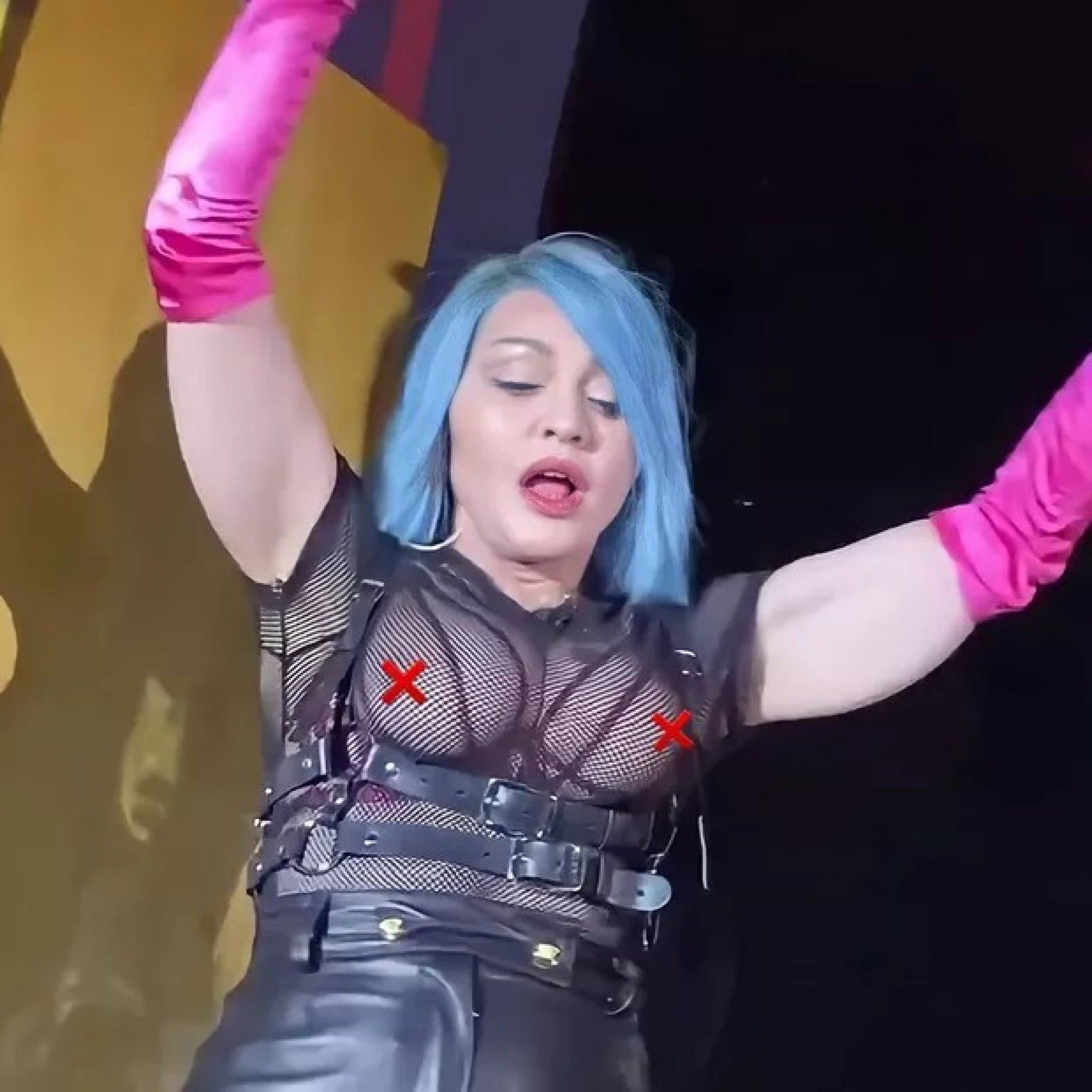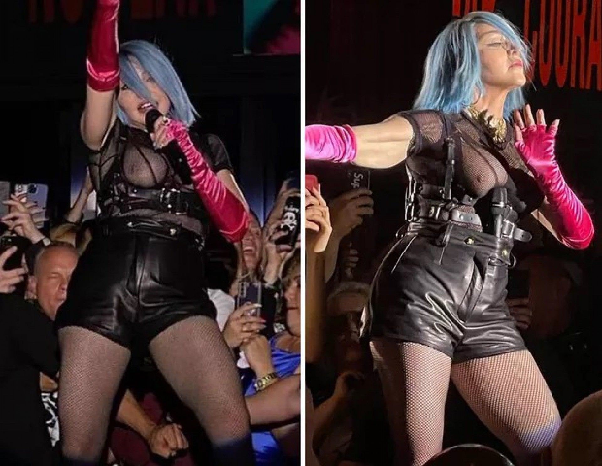 Aos 62 anos, a artista mostrou que está em forma, usando um figurino ousado, que deixou seus seios à mostra, além de uma peruca azul.