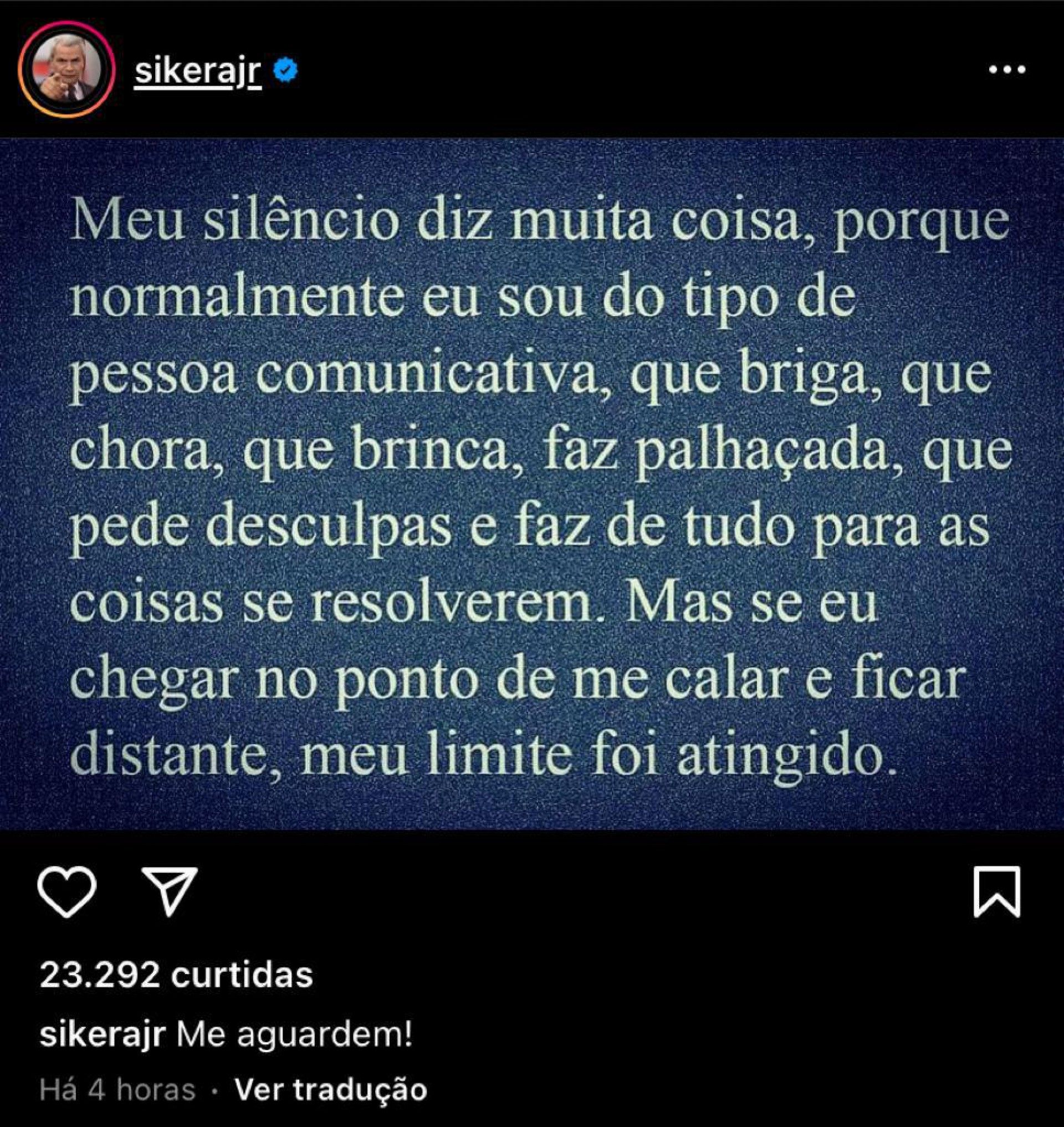 "Meu silêncio diz muita coisa, porque normalmente eu sou do tipo de pessoa comunicativa, que briga, que chora, que brinca, faz palhaçada, pede desculpas e faz de tudo para as coisas se resolverem. Mas se eu chegar no ponto de me calar e ficar distante, meu limite foi atingido", diz o texto na imagem publicada pelo jornalista.