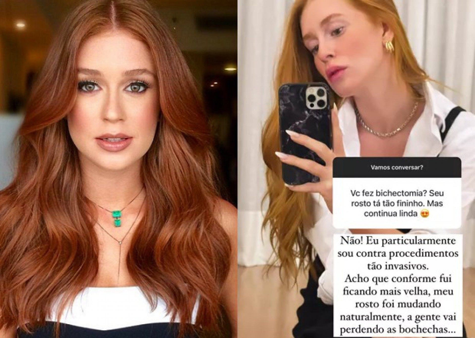 Nesta quinta-feira (12), Marina Ruy Barbosa dedicou o dia para interagir com seus fãs nas redes sociais. Em seus stories do Instagram, a atriz negou ter feito uma bichectomia, cirurgia plástica que retira o tecido gorduroso localizado na região interna das bochechas, e disse que o rosto mais fino é resultado do avanço da idade. "Você fez bichectomia? Seu rosto tá tão fininho. Mas continua linda", perguntou um seguidor à atriz.