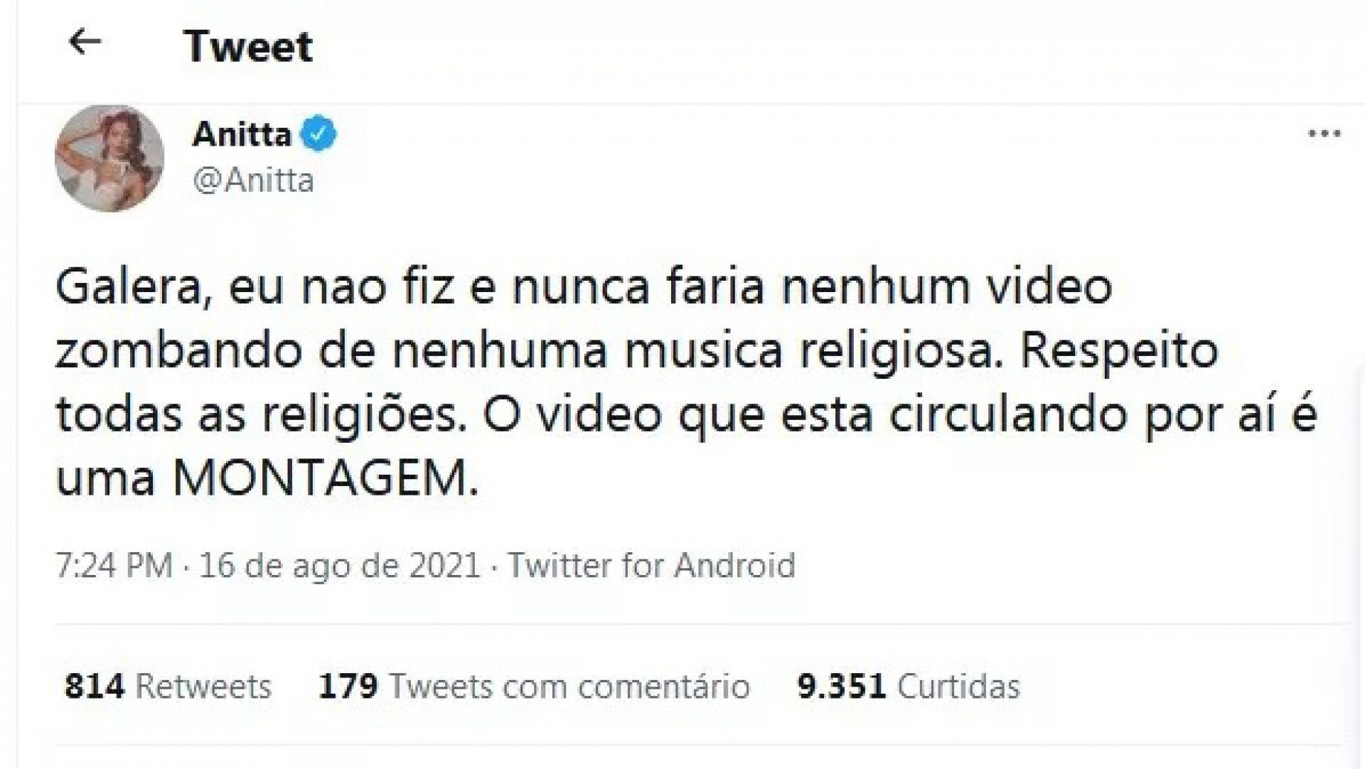 Nesta segunda-feira (16), Anitta usou as redes sociais para se pronunciar sobre uma montagem que viralizou na internet. No vídeo que circulou nesse final de semana, a artista aparece supostamente dançando ao som da música 'Se o Espírito de Deus Se Move em Mim', quando m verdade no vídeo original ela dança ao som de 'Wild Side', de Normani e Cardi B.- Em comunicado à imprensa, advogados de Simony rebatem acusações: 'Não existe qualquer dívida'