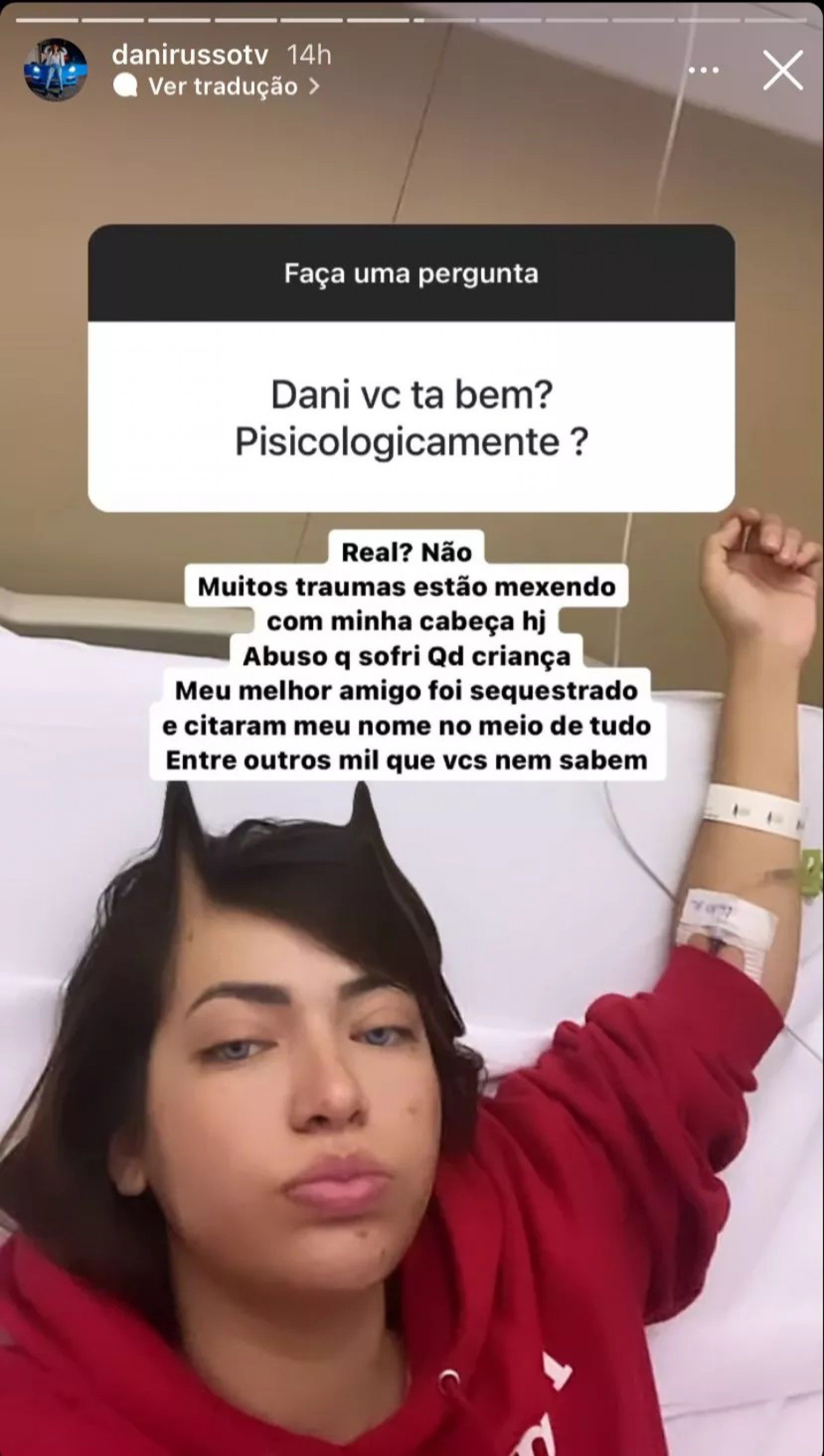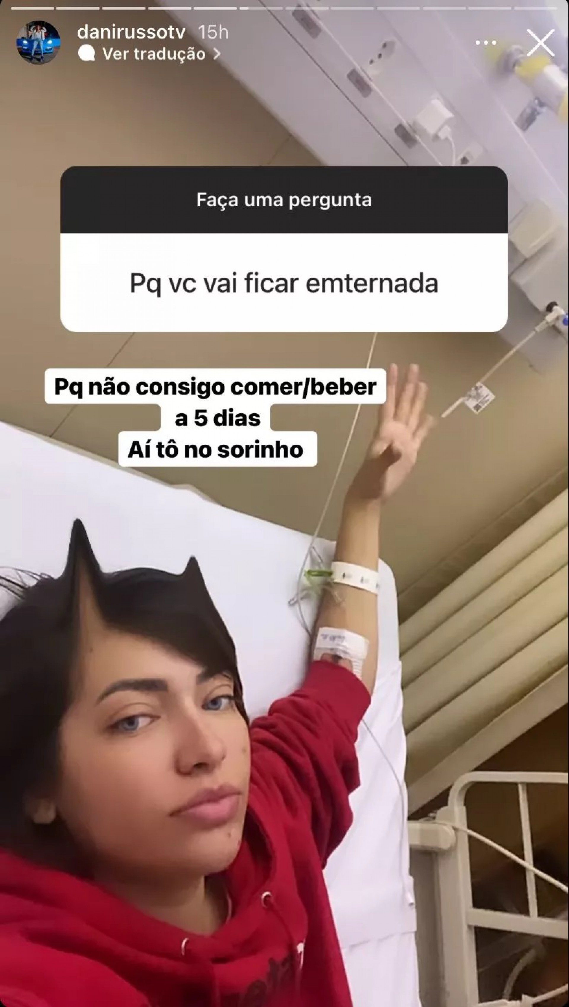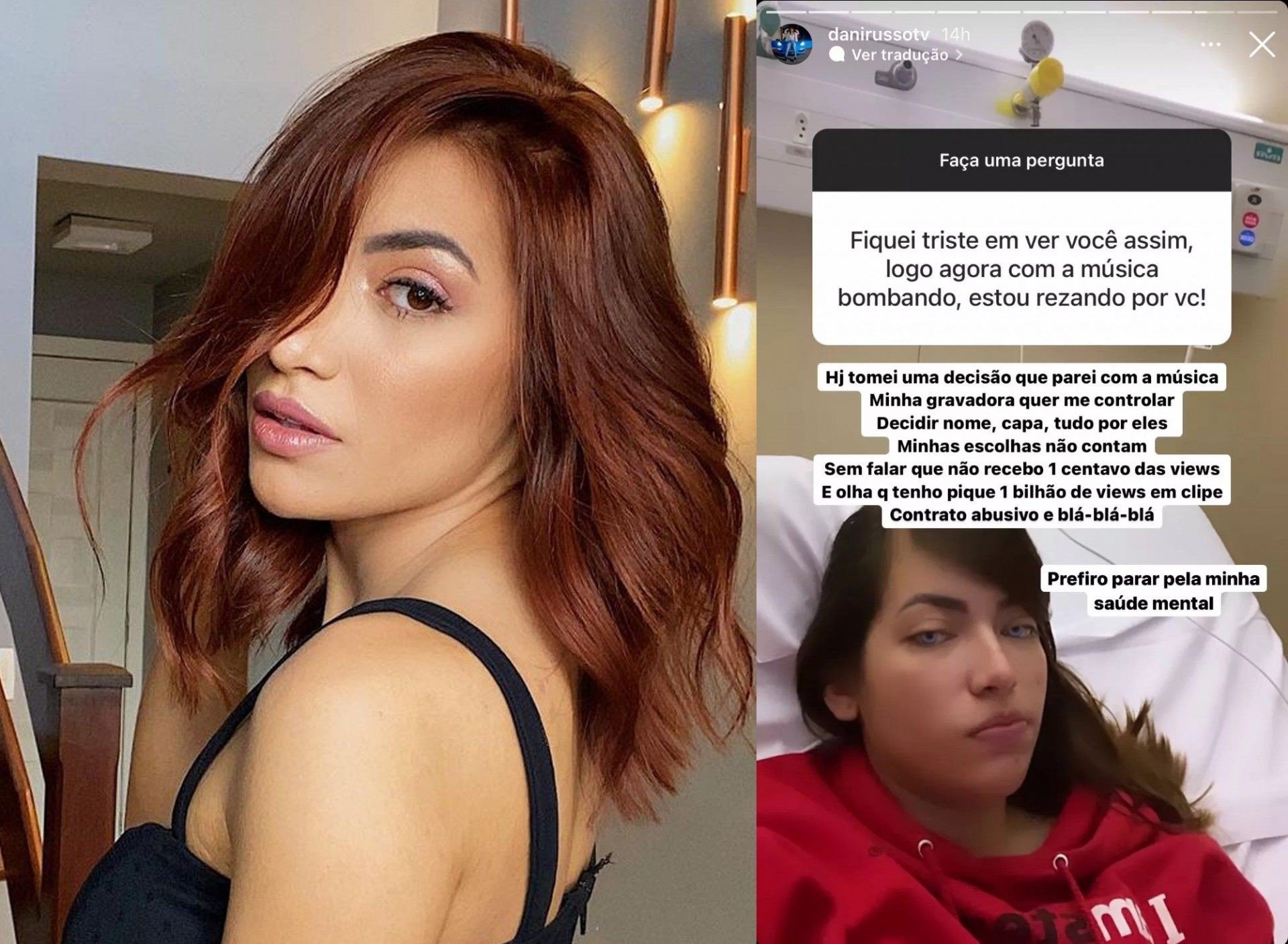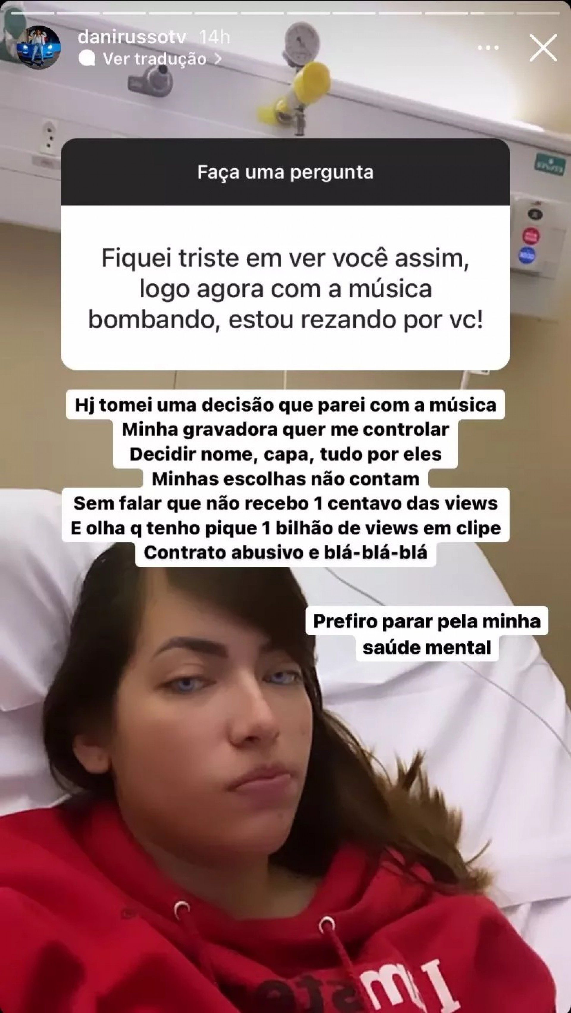 Na madrugada desta terça-feira (17), a Youtuber Dani Russo usou suas redes sociais para anunciar o fim de sua carreira como cantora. Nos stories do Instagram, ela explicou os motivos que a fizeram desistir da música e respondeu a uma seguidora o porquê de estar internada. "Não consigo comer, nem beber há 5 dias, aí tô no sorinho".
