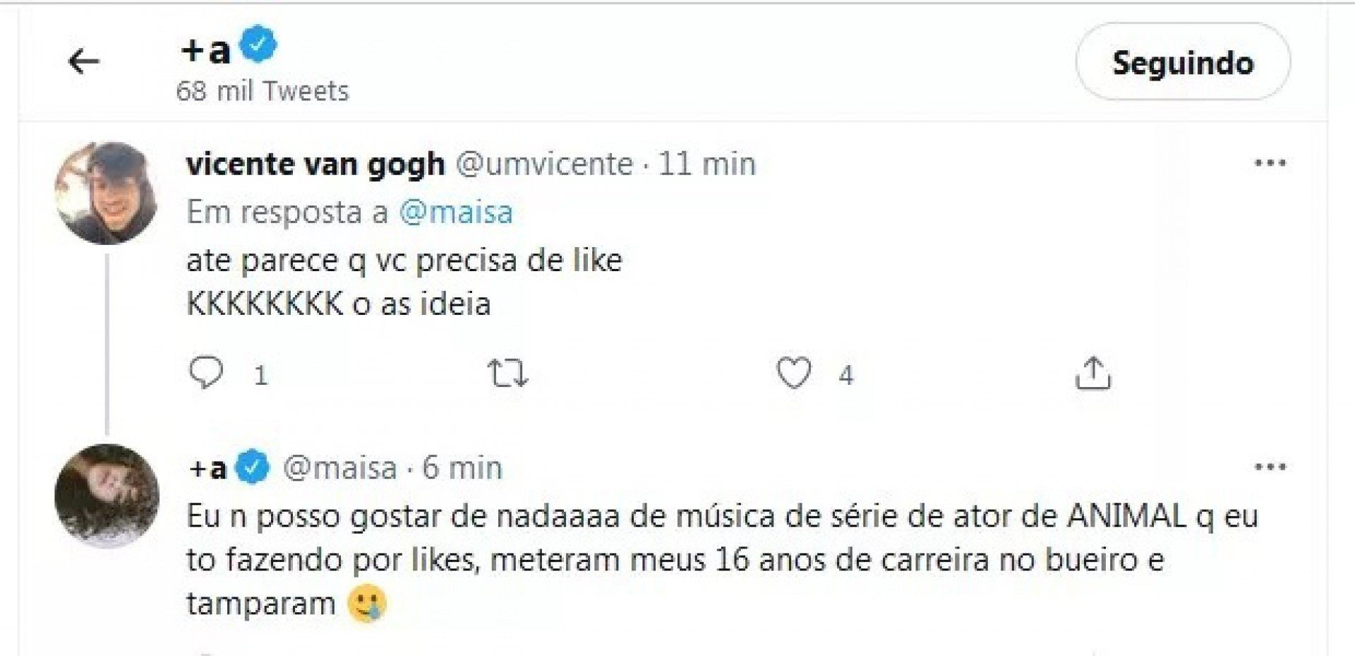 Em seguida, Maisa seguiu com seu desabafo. "Sinceramente tô apavorada com o nível de rancor das pessoas. Quem fica puto por foto de gato lindo maravilhoso no Twitter? Eu não posso gostar de nada, de música, de série, de ator, de animal, que eu tô fazendo por likes, meteram meus 16 anos de carreira no bueiro e tamparam", escreveu.