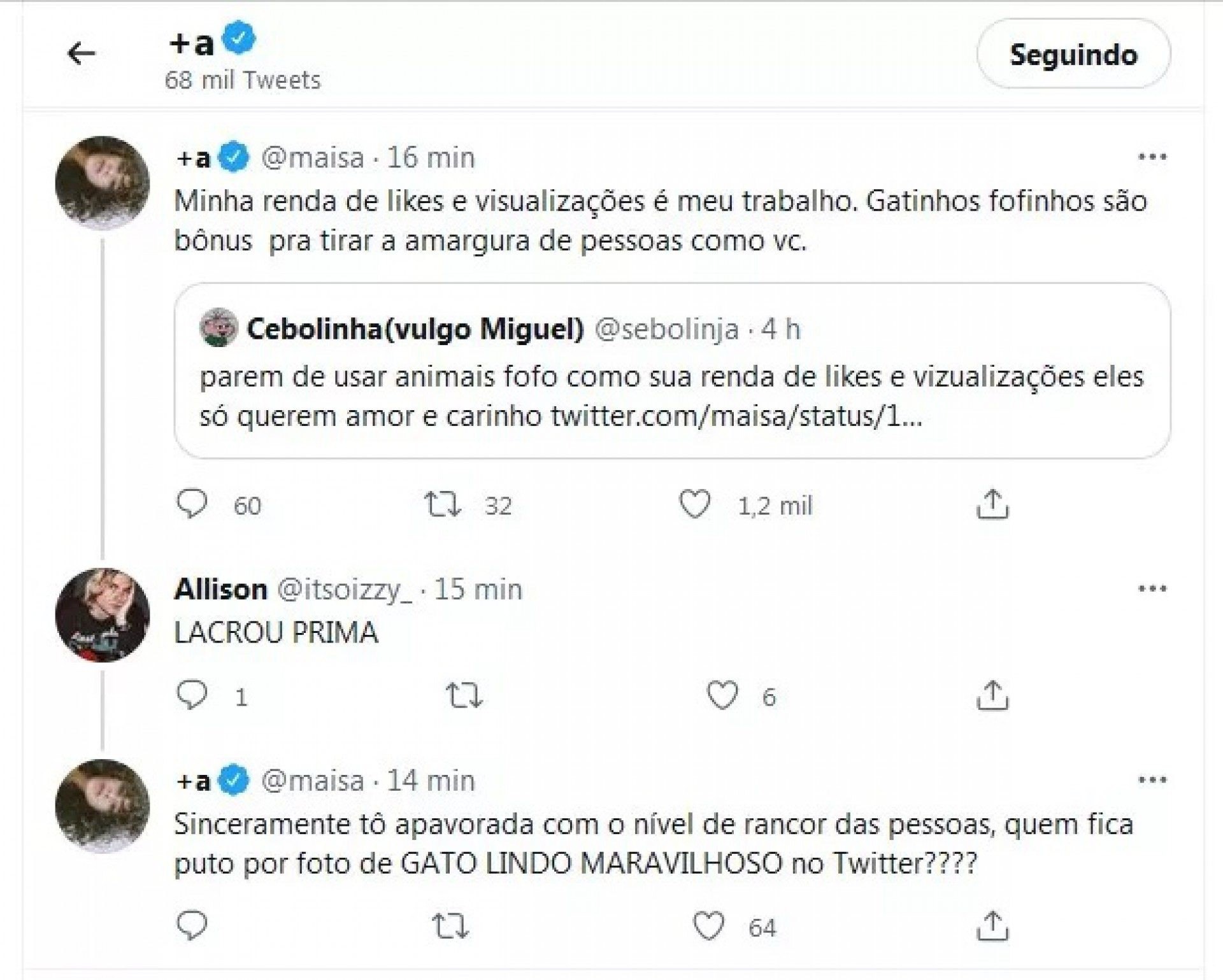"Parem de usar animais fofo como sua renda de likes e vizualizações. Eles só querem amor e carinho", escreveu o usuário do Twitter. "Minha renda de likes e visualizações é meu trabalho. Gatinhos fofinhos são bônus pra tirar a amargura de pessoas como você", rebateu ela.