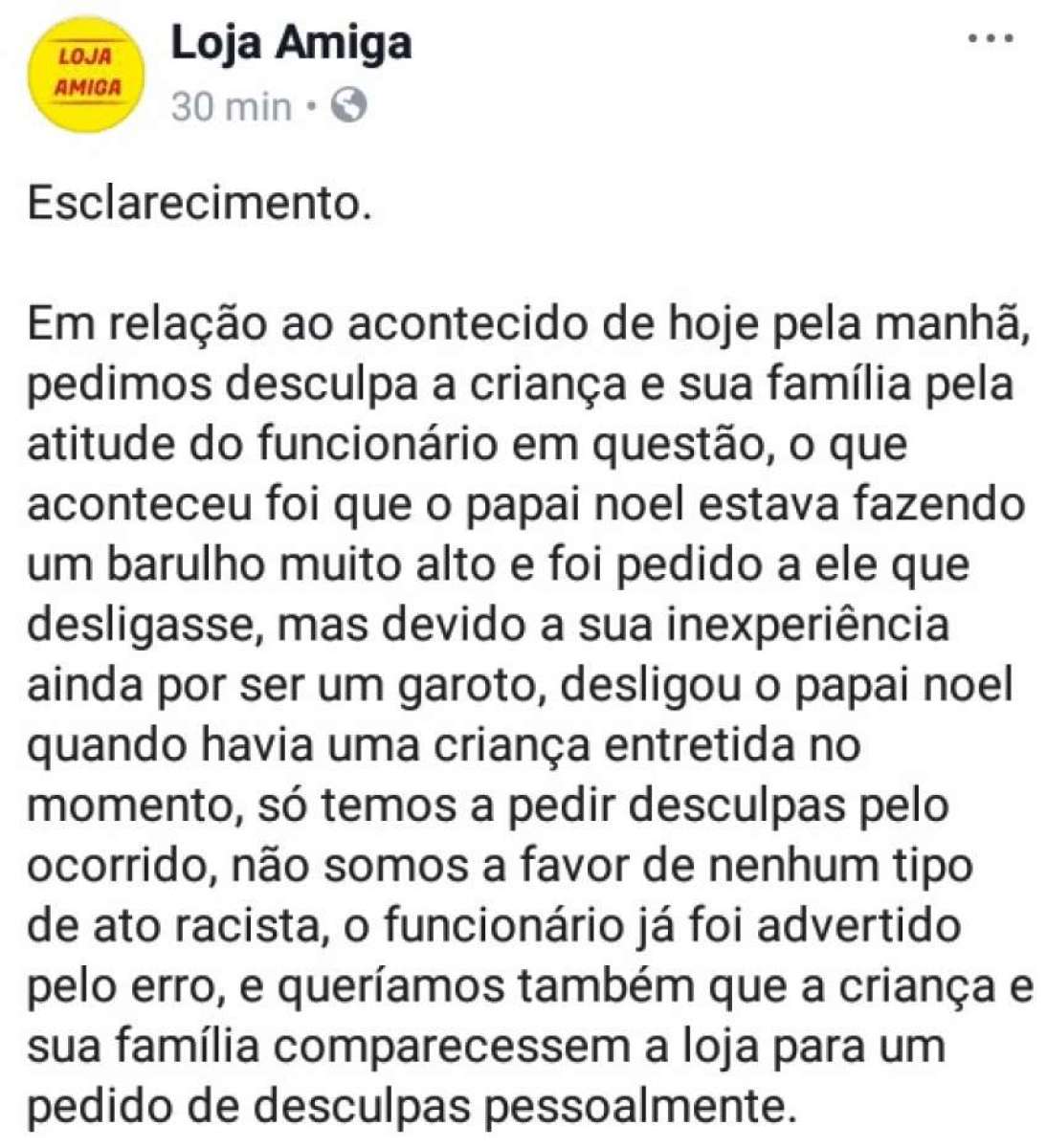 "Esclarecimento. Em relação ao acontecido de hoje pela manhã, pedimos desculpa a criança e sua família pela atitude do funcionário em questão, o que aconteceu foi que o papai noel estava fazendo um barulho muito alto e foi pedido a ele que desligasse, mas devido a sua inexperiência ainda por ser um garoto, desligou o papai noel quando havia uma criança entretida no momento, só temos a pedir desculpas pelo ocorrido, não somos a favor de nenhum tipo de ato racista, o funcionário já foi advertido pelo erro, e queríamos também que a criança e sua família comparecessem a loja para um pedido de desculpas pessoalmente".
