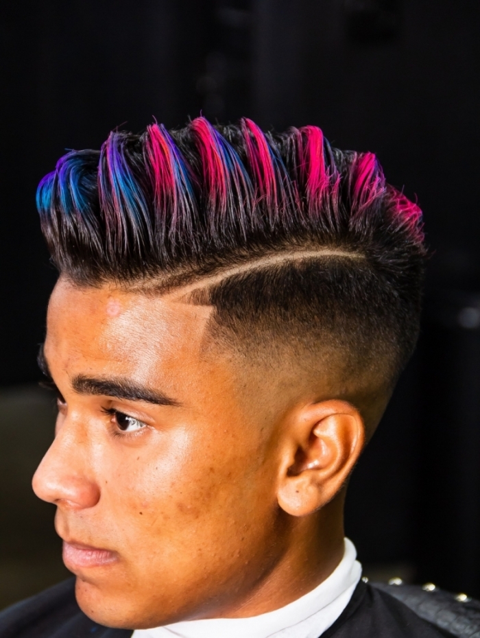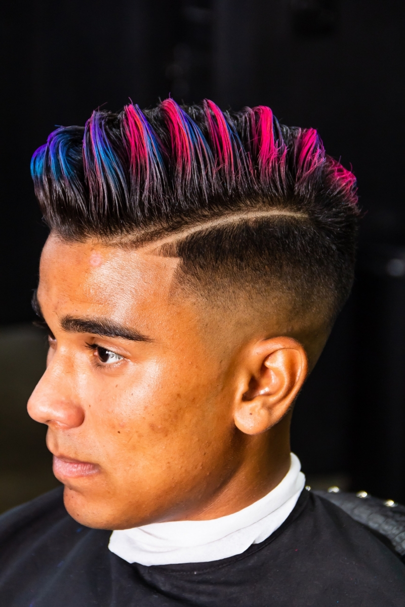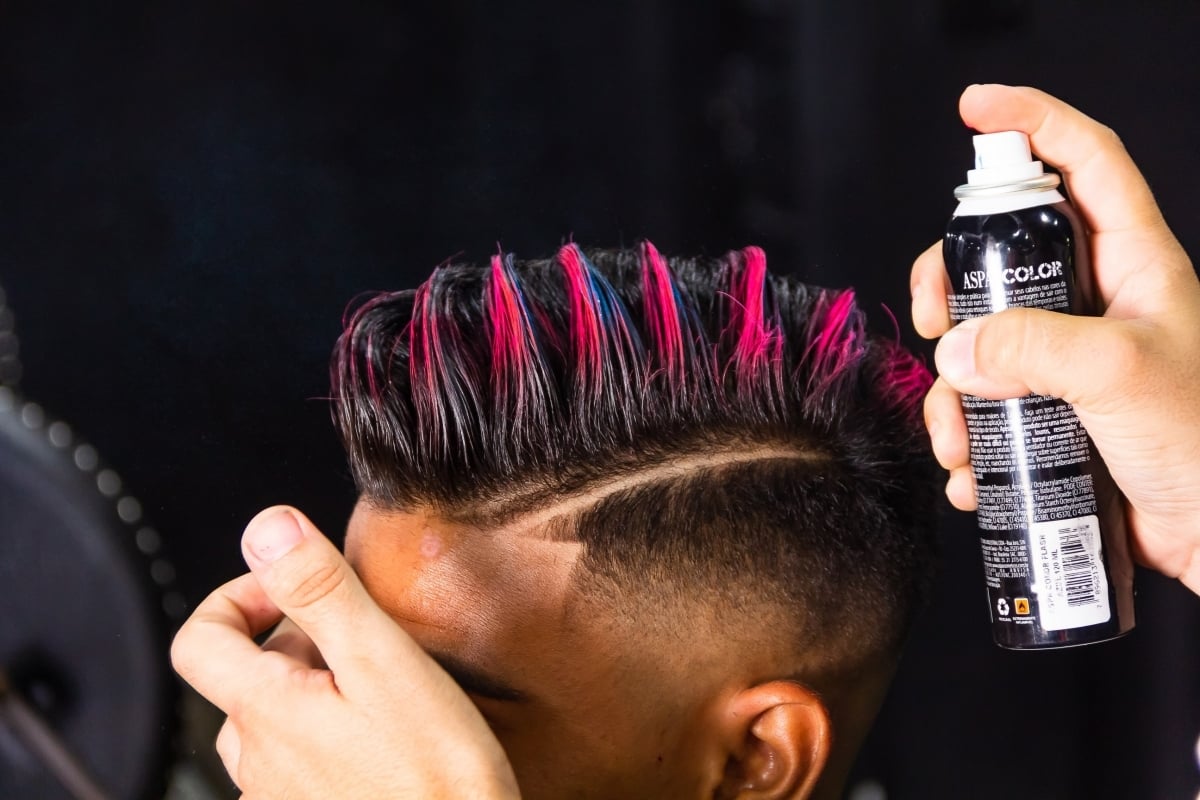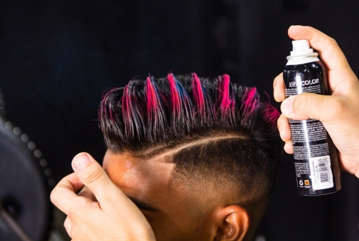 Coloração – esse último passo é opcional. A coloração é para quem quer dar bastante destaque para o penteado e gosta de um visual bem irreverente e descolado. O ideal é usar tinta spray, uso aqueles que saem ao lavar. Você pode brincar com quantas cores quiser. Selecionei o azul e o rosa para dar um efeito bem colorido. Como a intenção é só pintar o topo, você deve jogar o spray de traz pra frente, de traz da cabeça indo em direção ao topo. Só pra pintar mesmo o espaço desejado. E se quiser fazer detalhes, com um pincel bem pequeno você pode fazer os detalhes.