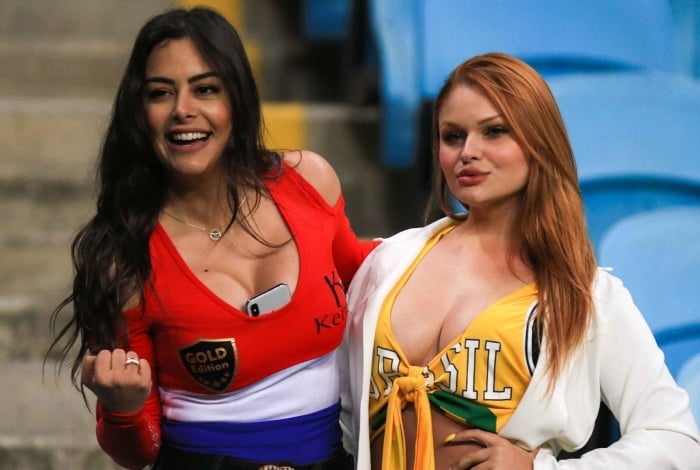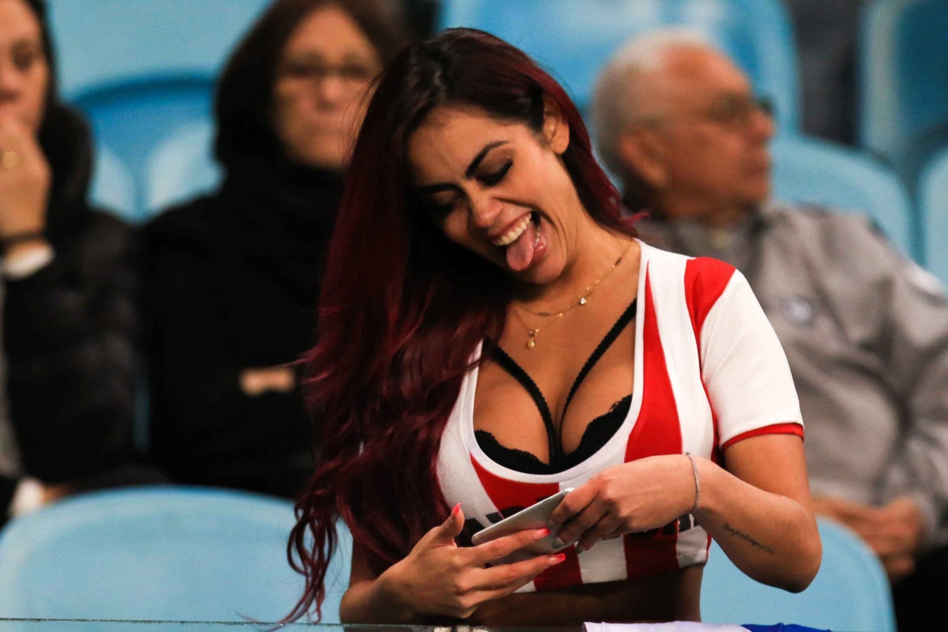 Larissa Riquelme, torcedora símbolo do Paraguai, parou as arquibancadas durante partida valida pelas quartas de final, da Conmebol Copa América, na Arena do Grêmio, em Porto Alegre, na noite desta quinta-feira (27). A beldade era só sorrisos ao torcer pelo seu país e aproveitou para guardar seu celular nos seios.