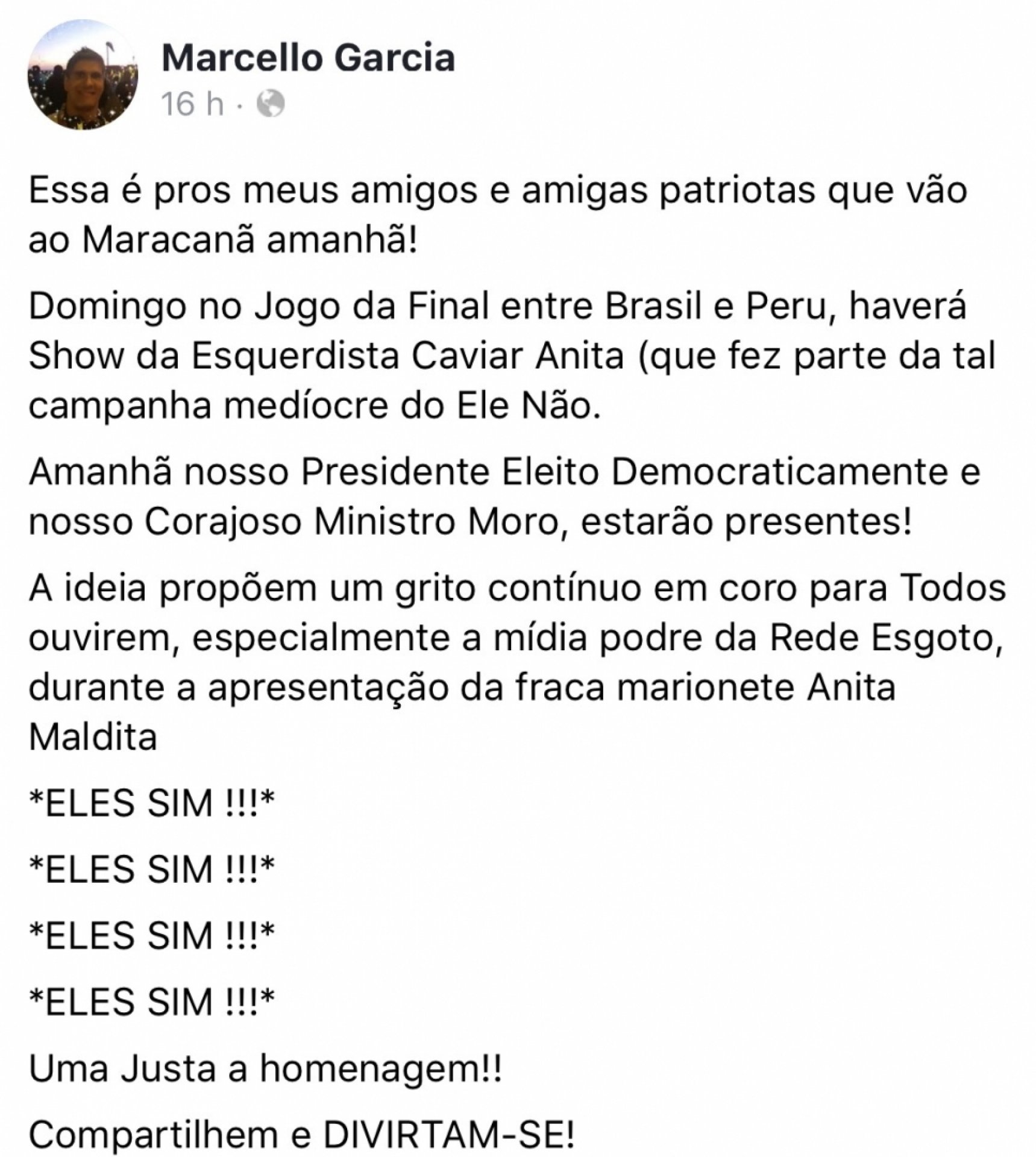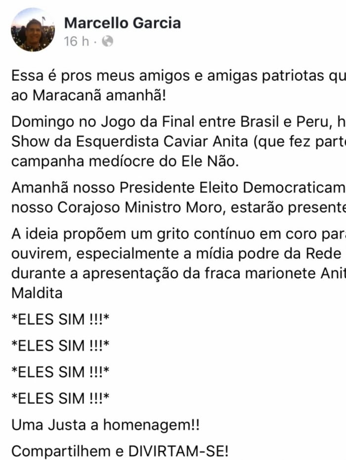 Neste sábado (6), o irmão do apresentador Márcio Garcia, Marcello Garcia, se exaltou contra Anitta em sua página pessoal do Facebook. Ele incitou seus seguidores a repudiar Anitta durante a execução do Hino Nacional no jogo da final de hoje da Copa América no Maracanã.