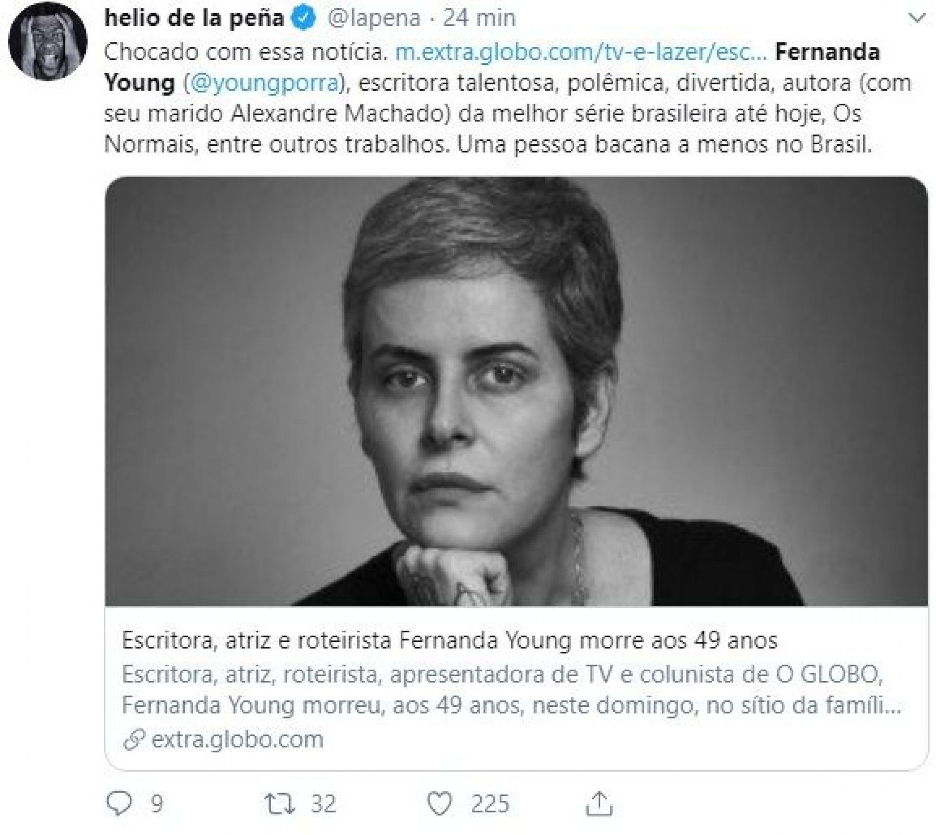 A atriz e escritora Fernanda Young, faleceu na madrugada deste domingo (25) no sítio da família na cidade de Gonçalves, em Minas Gerais, devido a complicações ligadas a sua asma. Ela foi levada de ambulância até uma cidade vizinha após ter uma crise de asma, mas teve uma parada cardíaca e não resistiu. A equipe médica tentou reanimá-la, sem sucesso.