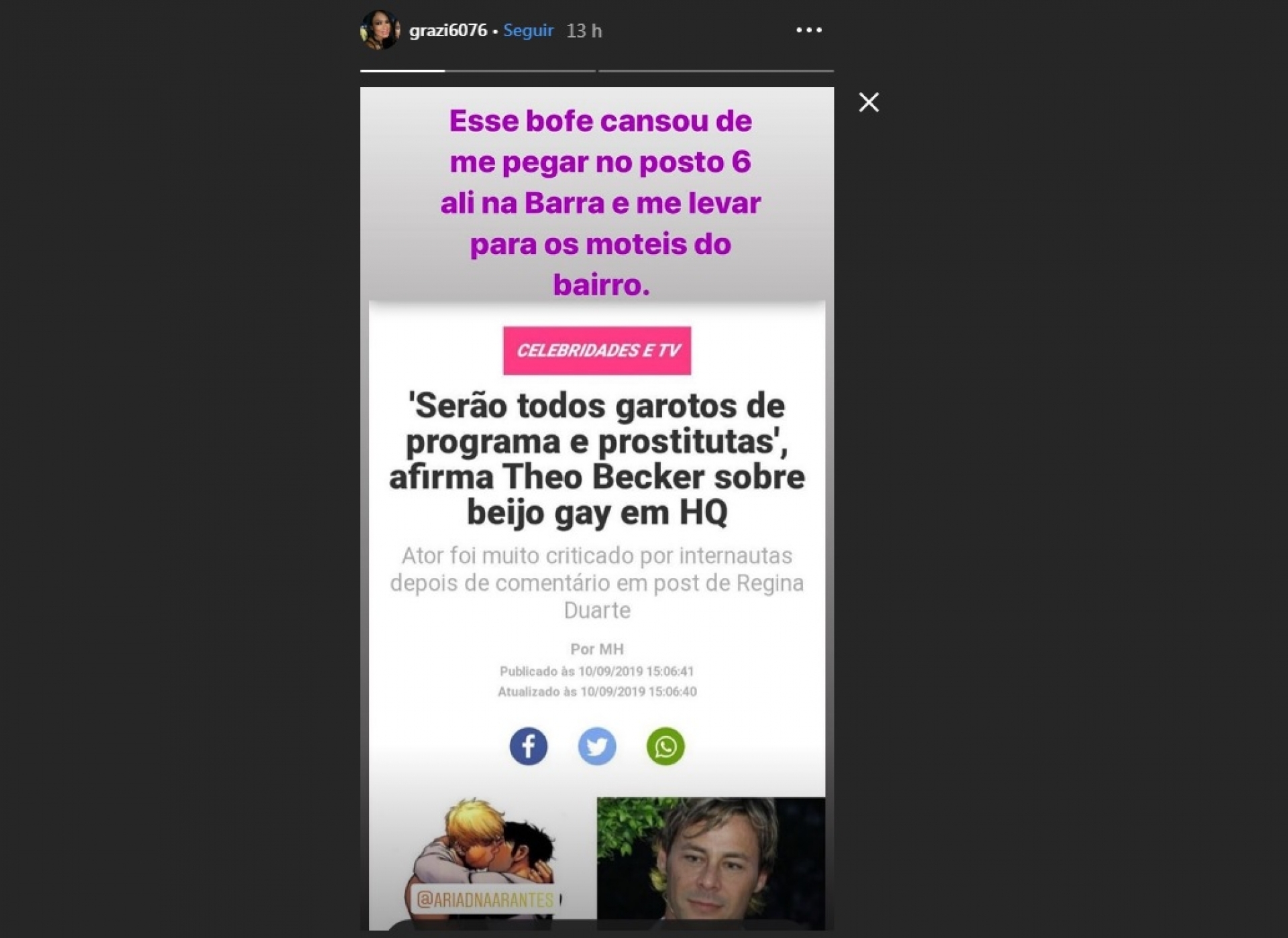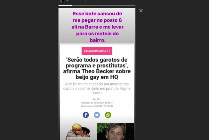 Nesta terça-feira Theo Becker virou alvo de polêmica na internet após ter comentado em uma postagem da atriz Regina Duarte, que era contra o ‘temido’ beijo gay nos livros da Bienal. Isso gerou uma repercussão imensa e a ex-BBB e modelo, Ariadna, acabou fazendo um desabafo em seu Instagram e o taxou de hipócrita e ainda afirmou que já tinha pago para sair com ela e outras trans no passado. Após ter sido noticiado pelo #QueIssoGordinho o relato da morena, outra trans apareceu para dizer o ator ele também já teria corrido atrás dela para fazer programas com ela na Barra da Tijuca, Zona Oeste do Rio de Janeiro.