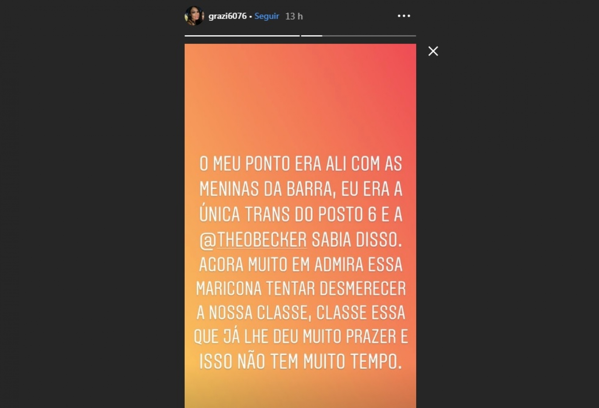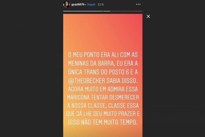Grazy postou em seus 'stories' do Instagram relatos de que Theo teria um hábito peculiar. Afirmou que constantemente passava pelo posto 6 na praia para escolher entre as meninas e sempre escolhia ela, mesmo sabendo que ela era transsexual.- Jean Wyllys dará aulas e fará pesquisa sobre ‘fake news’ em Harvard