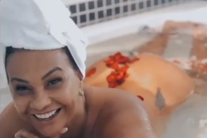 Na primeira foto ela aparece nua na banheira, coberta com espuma e pétalas de rosa.