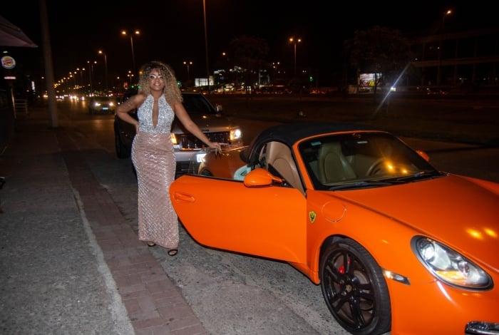 A aniversariante chegou ao local cantando pneu em um a carro importado laranja.