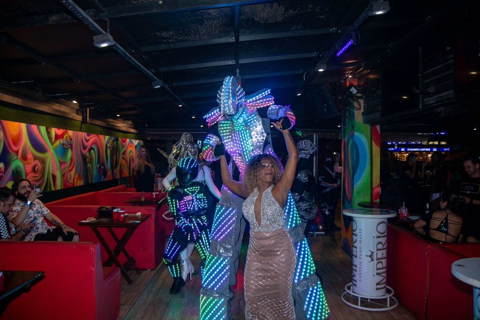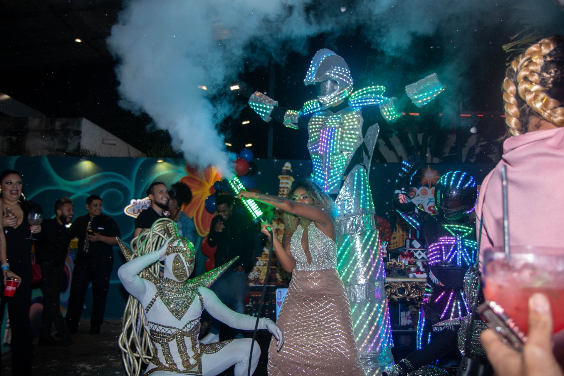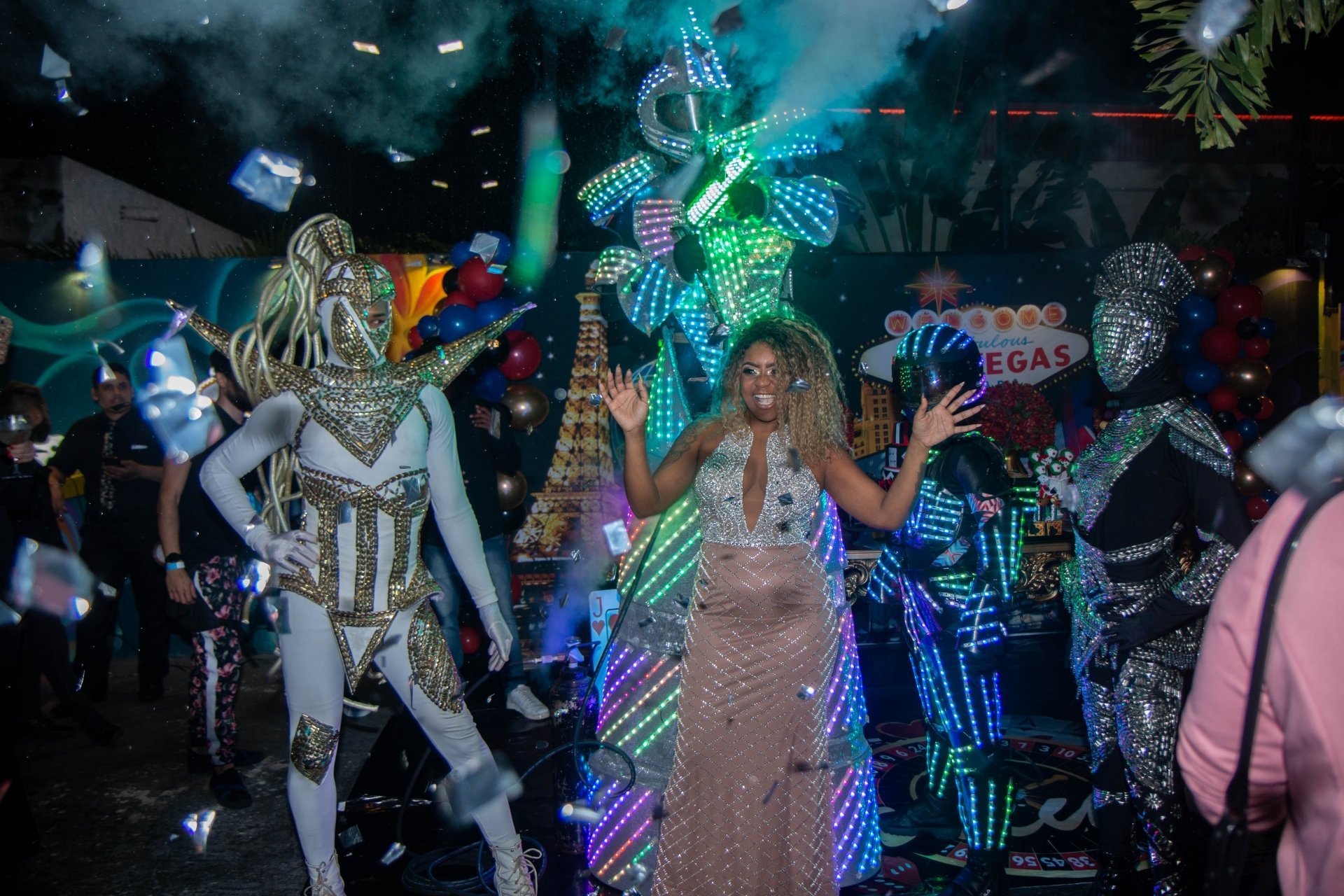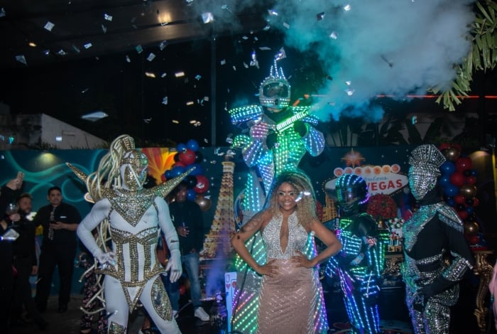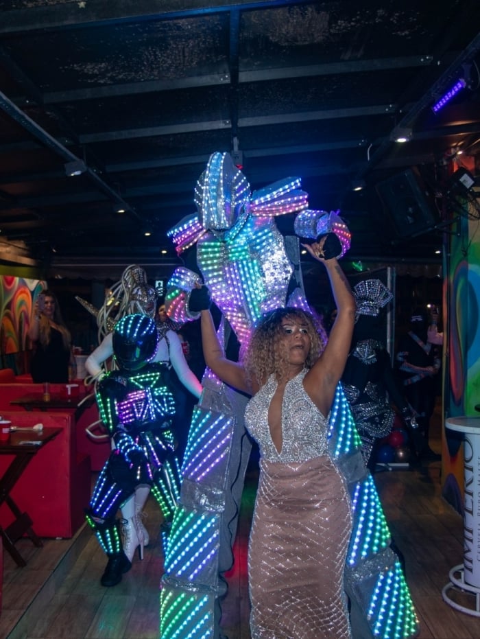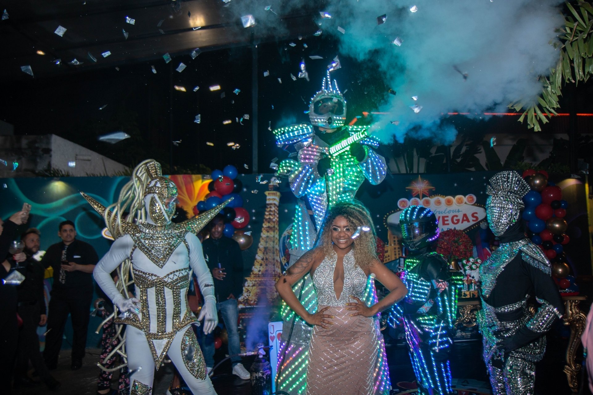 Ao lado de seus convidados, ela se divertiu com seus animadores de festa e robôs gigantes luminosos, que soltavam fumaça.