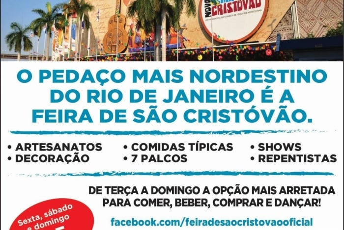O espaço mais Nordestino do Rio de Janeiro, a Feira de São Cristóvão, recebe neste feriado da Consciência Negra uma festa animada com muita música para alegrar nossa nação forrozeira. Na Praça dos Repentistas haverá som mecânico e nos palcos nossas bandas da casa com o melhor do forró, arrocha e sertanejo. Salvo as cortesias previstas em lei, lembramos que o esquipamento tem a entrada no valor de R$ 5 (cinco reais).