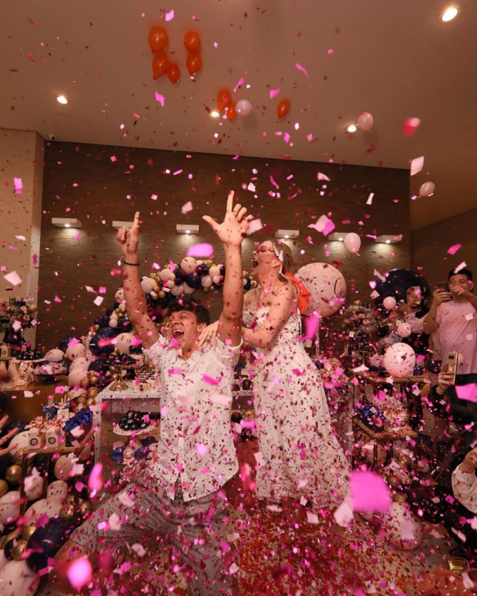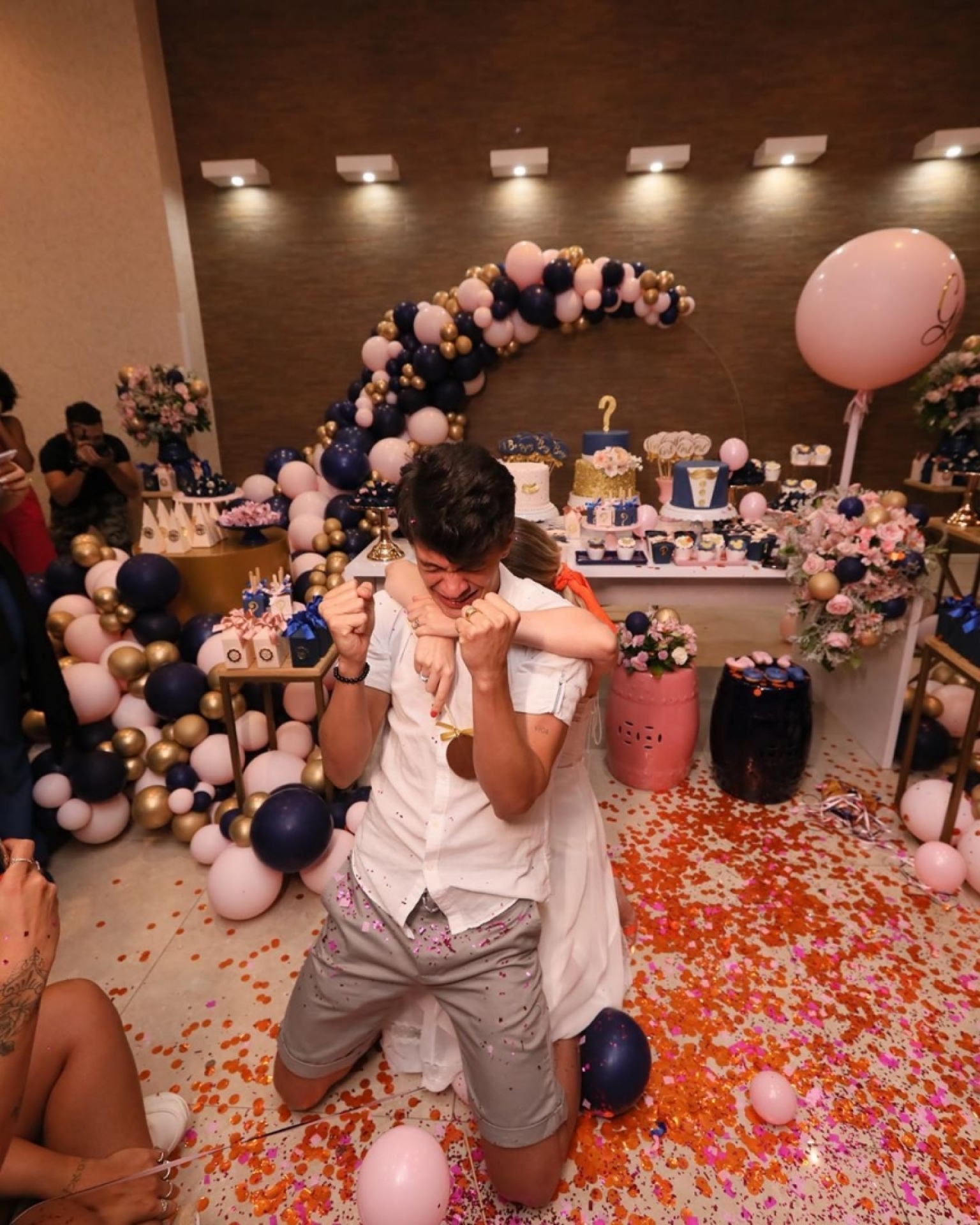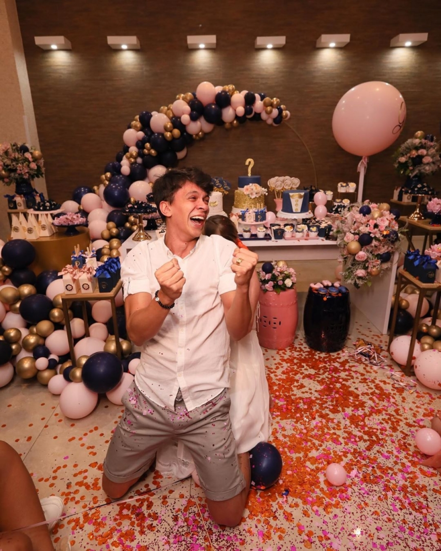 A festa, que teve patrocínio de uma marca de fralda, foi toda feita em azul e rosa com toques de dourado e deixou os fãs felizes da vida com a notícia.