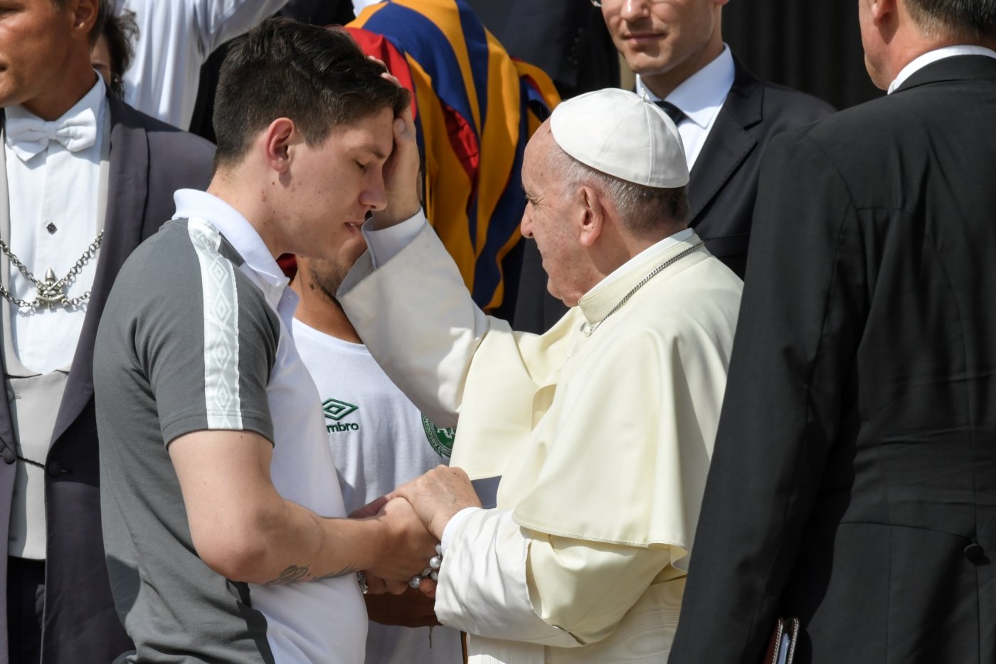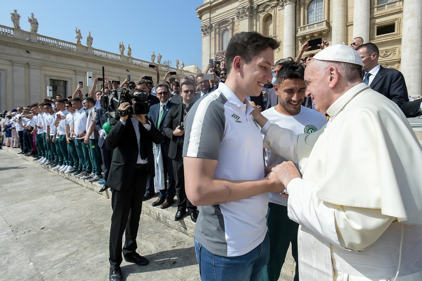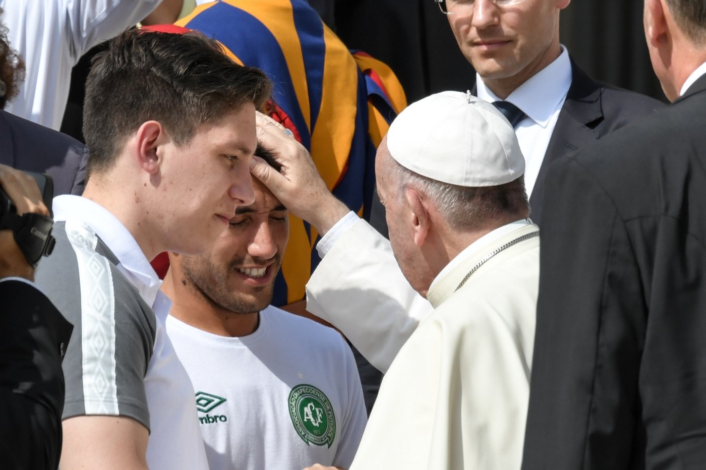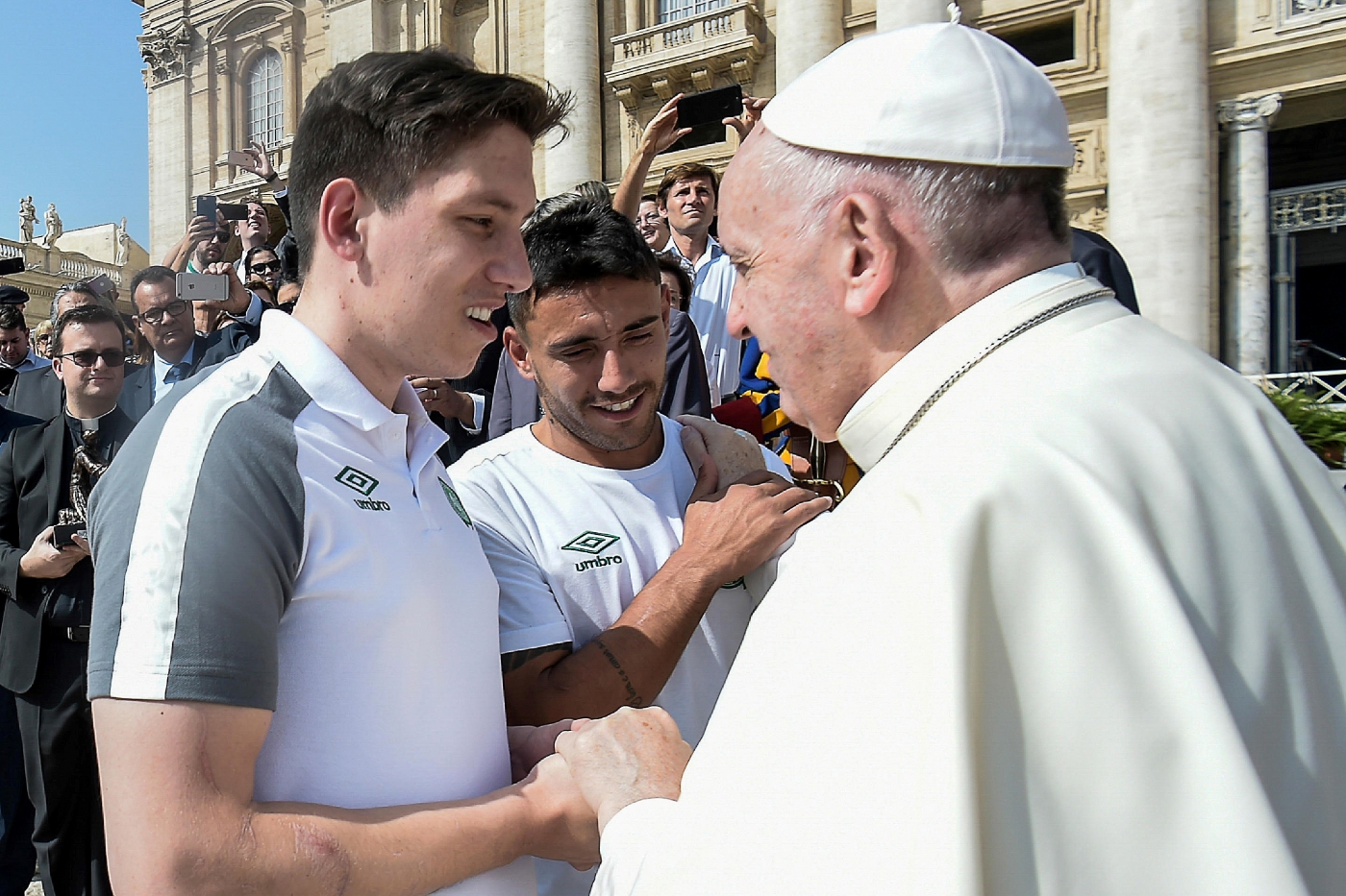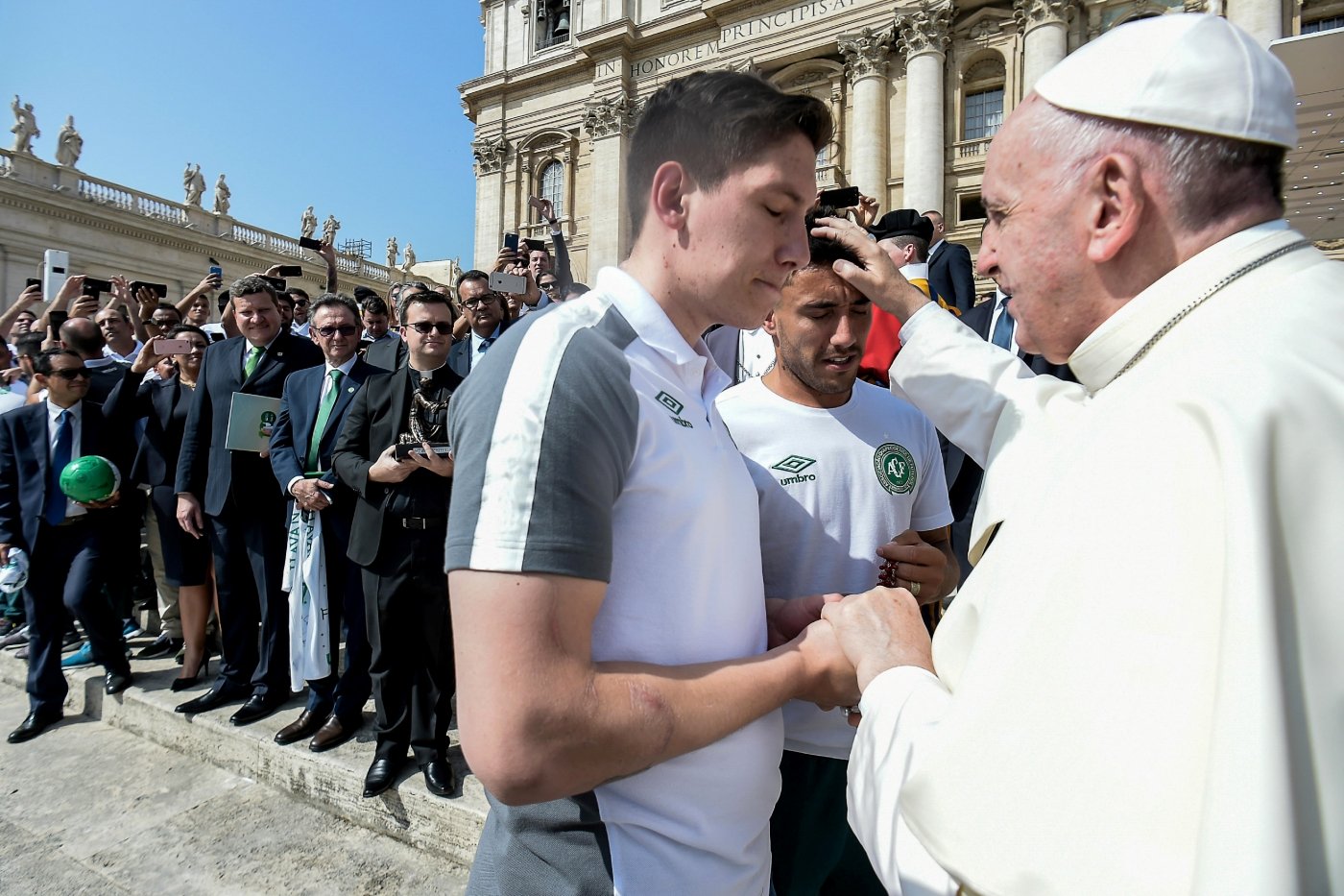 On their way to the Copa Sudamerica final to play Atletico Nacional last November, 19 Chapecoense players and 24 club officials were amongst 71 people killed when their plane crashed in Colombia. Only three players, including Follmann and Ruschel, survived the crash. / AFP PHOTO / OSSERVATORE ROMANO / HO / RESTRICTED TO EDITORIAL USE - MANDATORY CREDIT "AFP PHOTO / OSSERVATORE ROMANO" - NO MARKETING NO ADVERTISING CAMPAIGNS - DISTRIBUTED AS A SERVICE TO CLIENTS