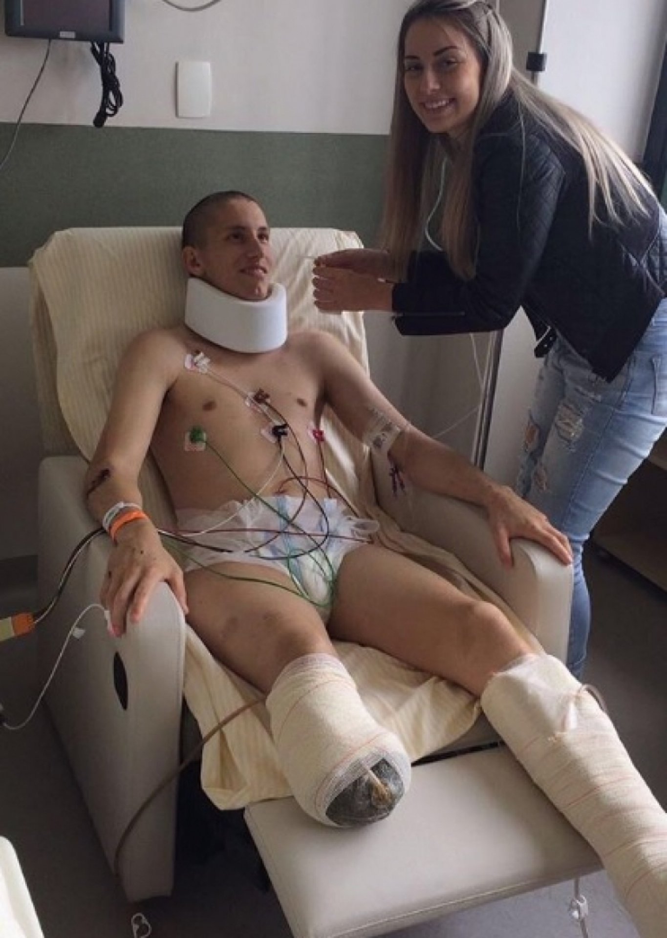 Ruschel and Follmann are two of six survivors of the November 2016 plane crash that left 71 people dead, including 19 Chapecoense players. / AFP PHOTO / ANDREAS SOLARO