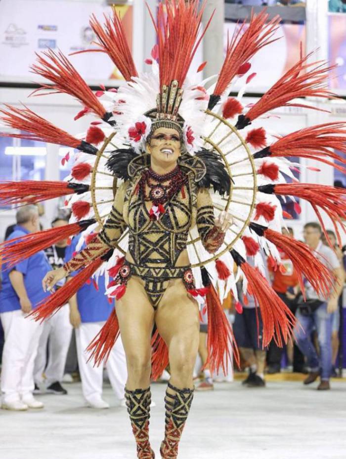 Vestida de Deusa da Mata, a rainha da Estácio de Sá, Jack Maia abriu a noite de desfiles à frente dos ritmistas da escola do São Carlos.