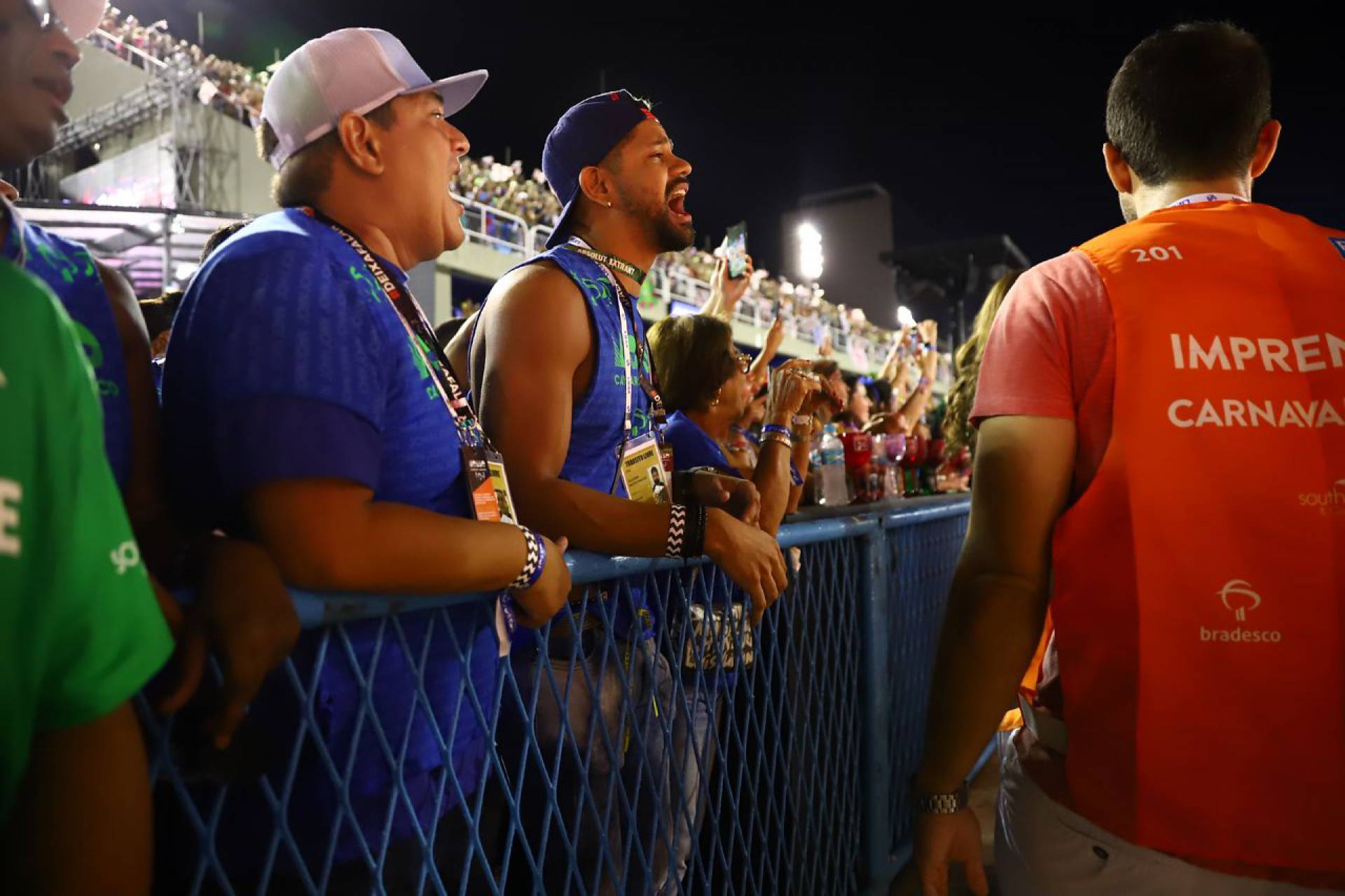 Viviane Araújo reinou à frente da bateria do Salgueiro e fez questão de passar para ver o namorado, que a aguardava em umas das frisas da Sapucaí. A gata tascou um beijão no namorado e voltou para a Avenida. Veja fotos!
