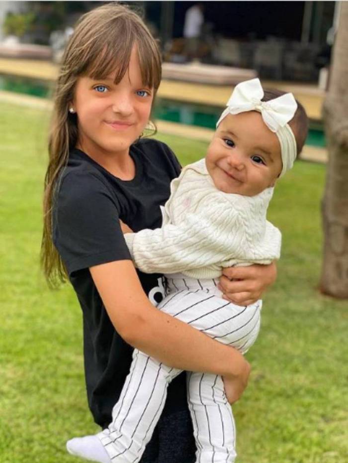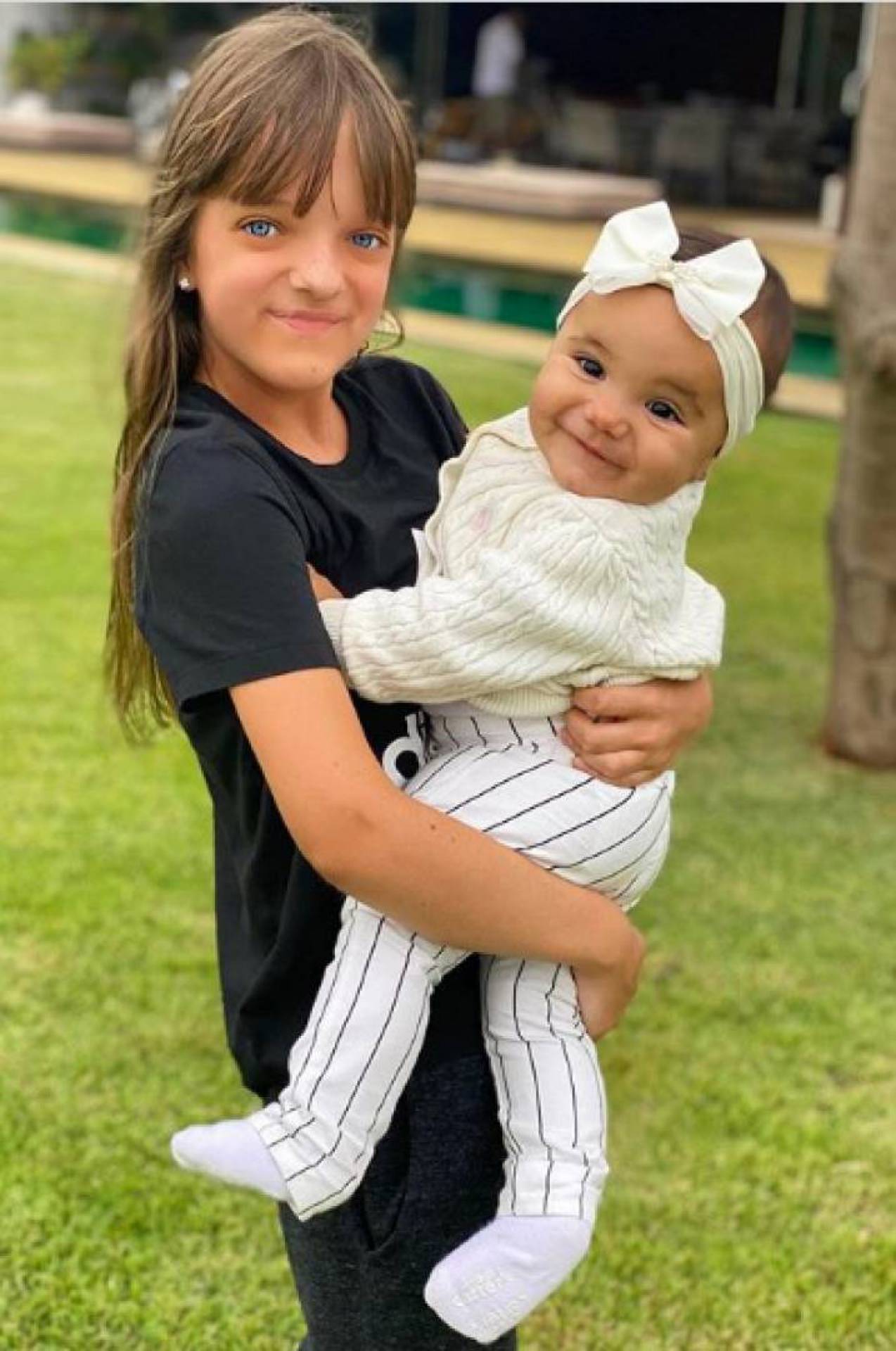 Rafaella Justus, de 10 anos, apareceu segurança sua irmã caçula, Manuella, de 7 meses, no colo. Na legenda, Ticiane se derreteu pela cria: "O melhor de mim. Fim de semana abençoado com elas".- Galvão Bueno não vai narrar Copa e preocupa Globo