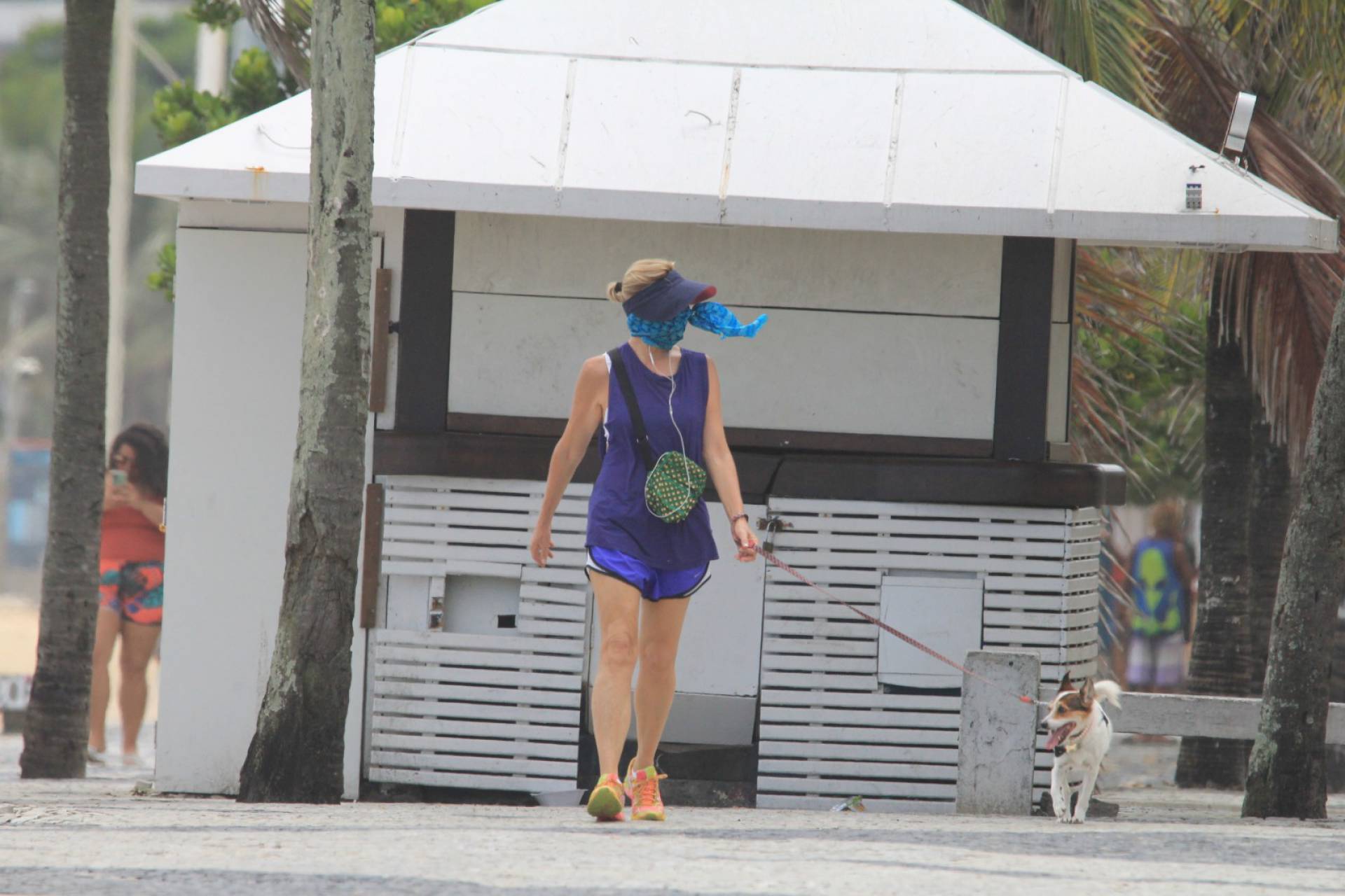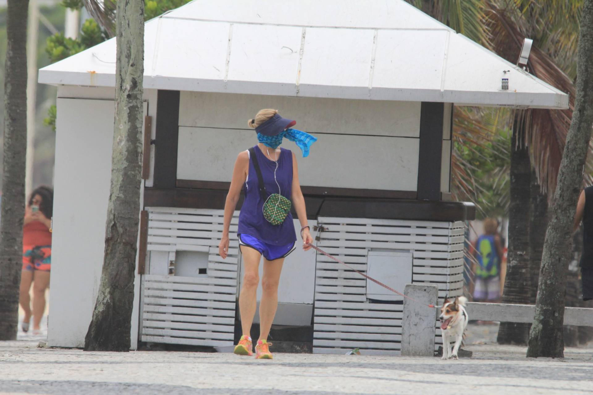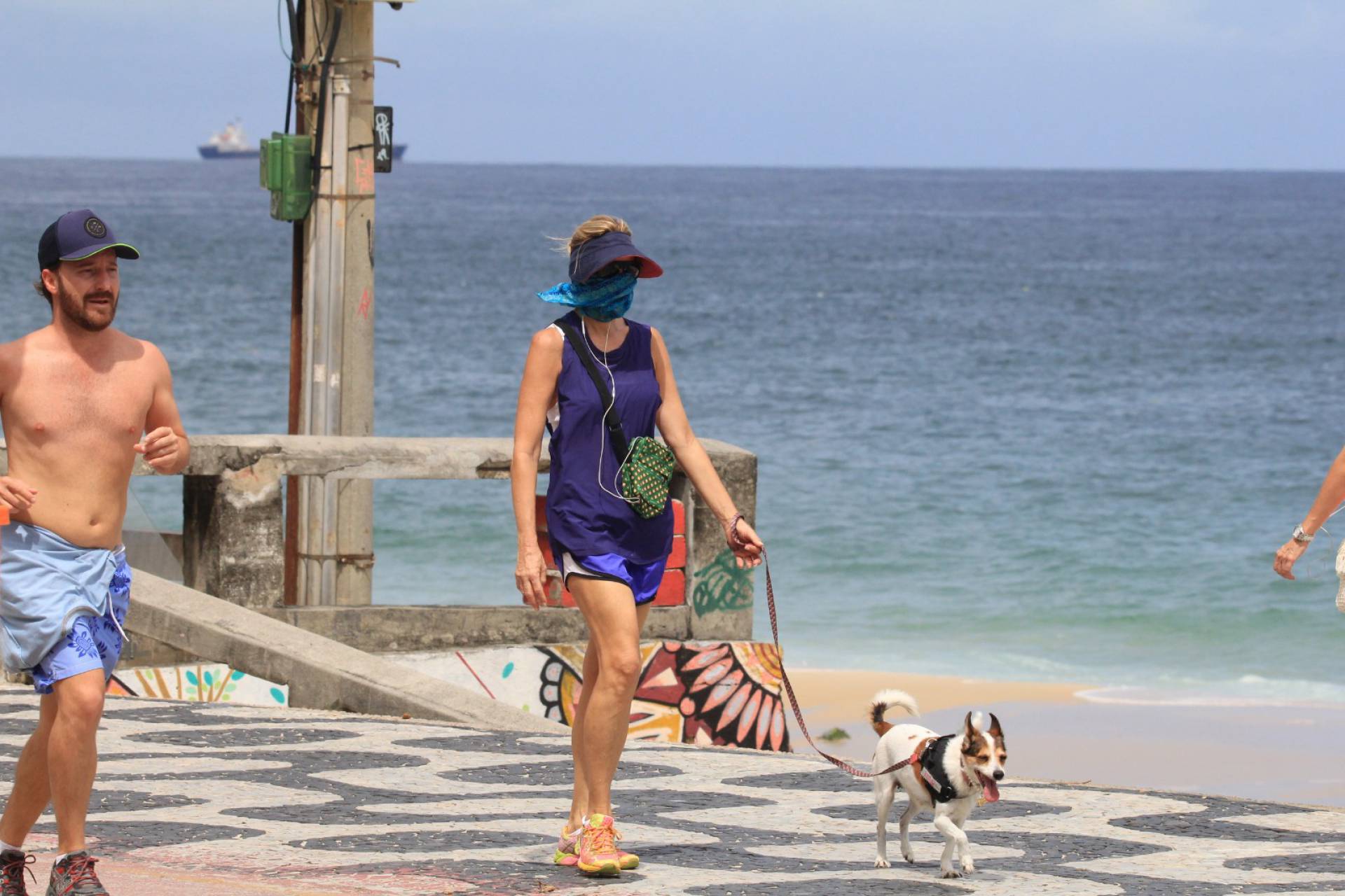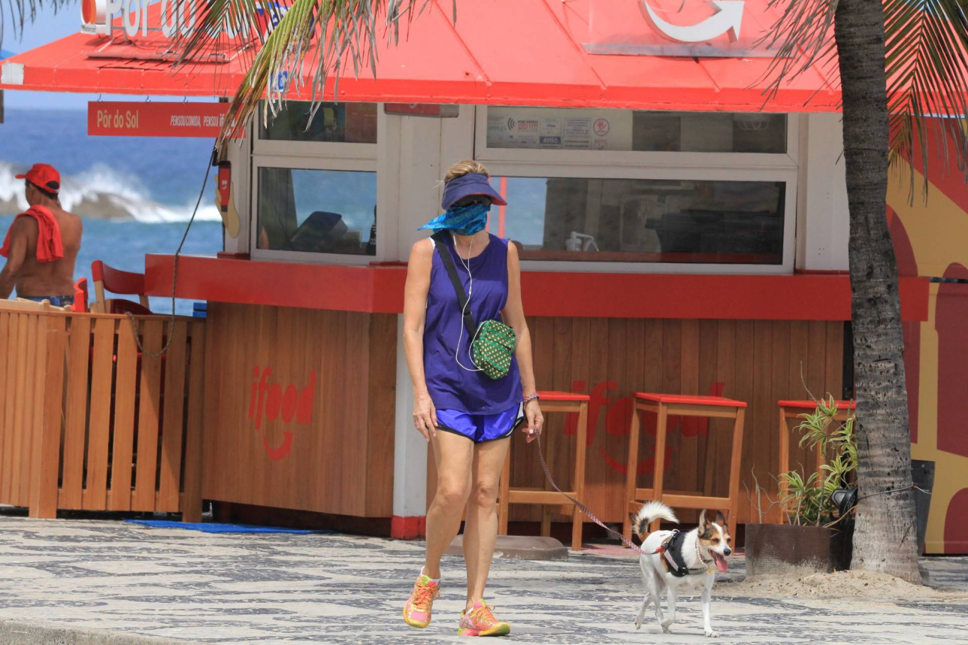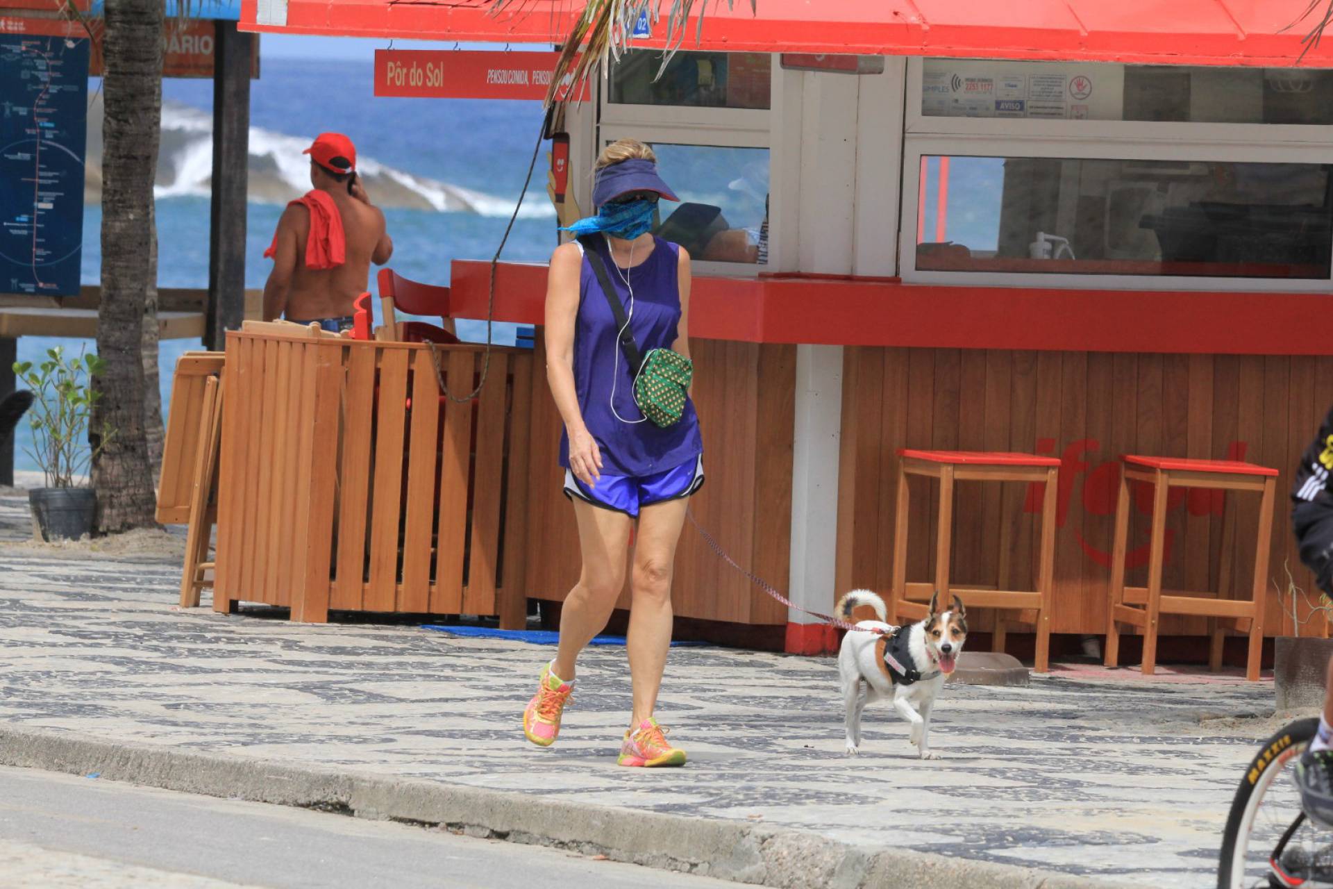 Atriz foi flagrada por paparazzo enquanto levava seu cachorrinho para passear pela orla de Ipanema, na Zona Sul da capital.