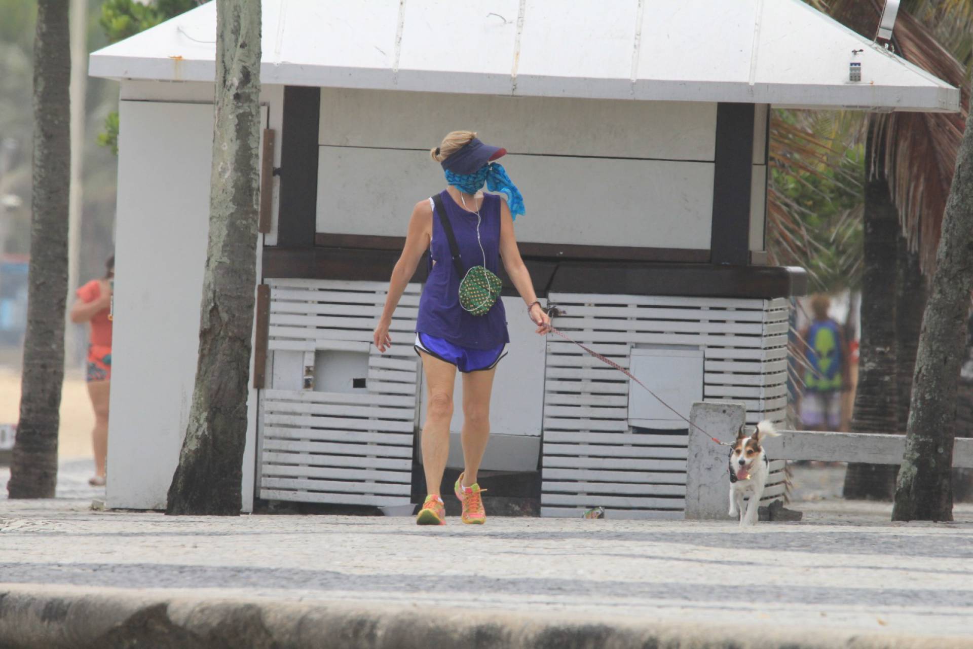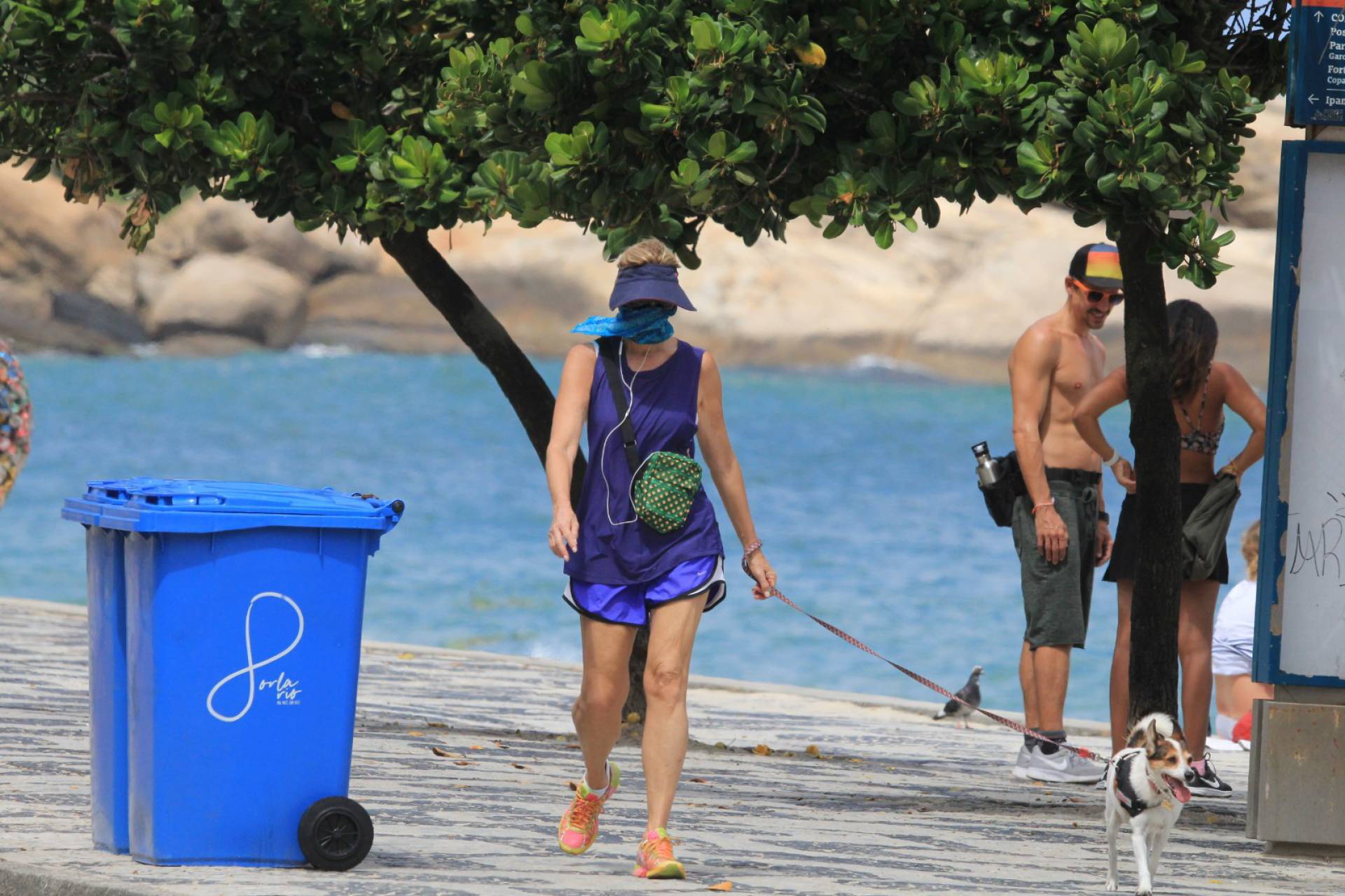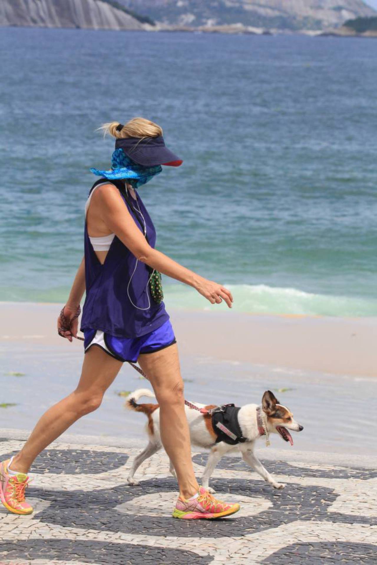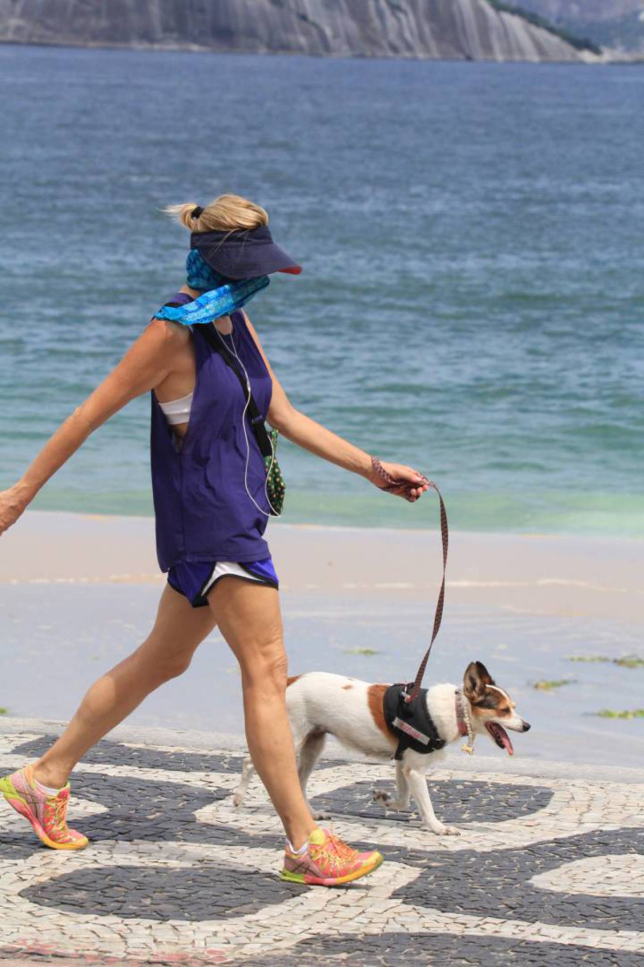 Atriz foi flagrada por paparazzo enquanto levava seu cachorrinho para passear pela orla de Ipanema, na Zona Sul da capital.