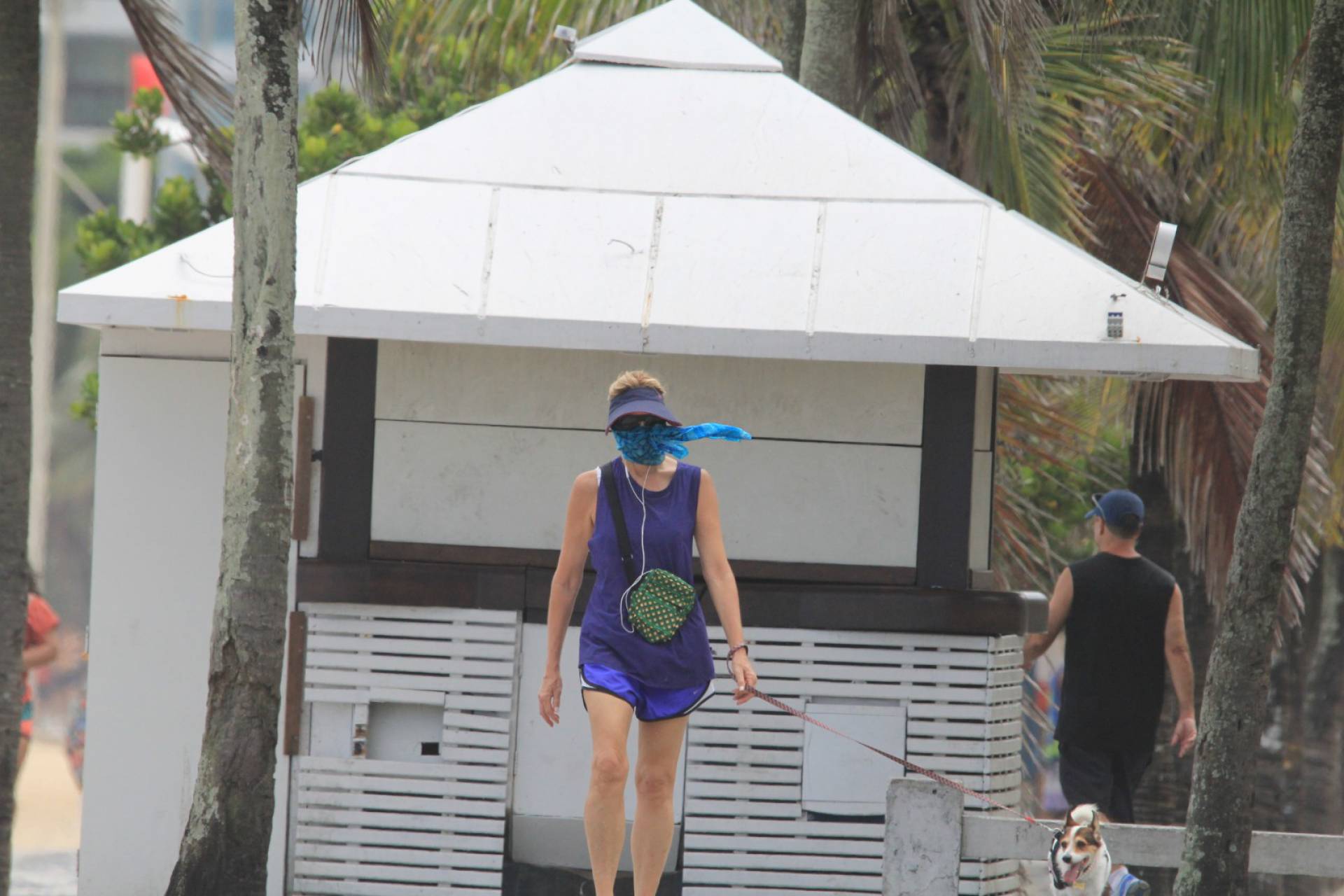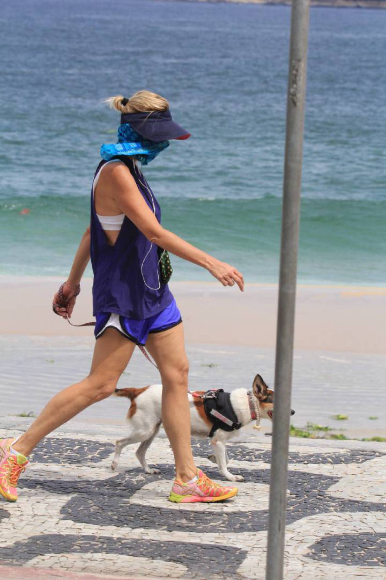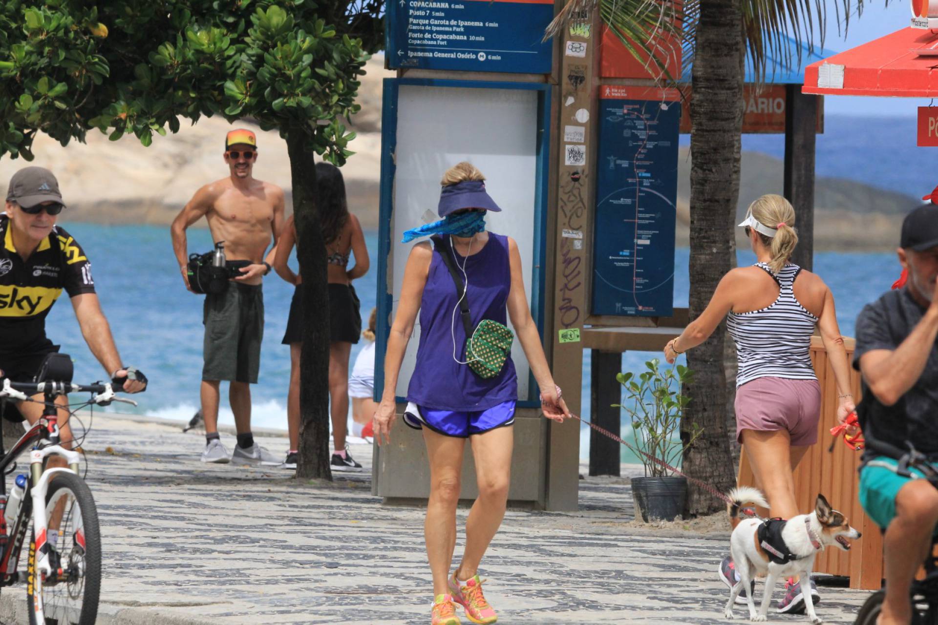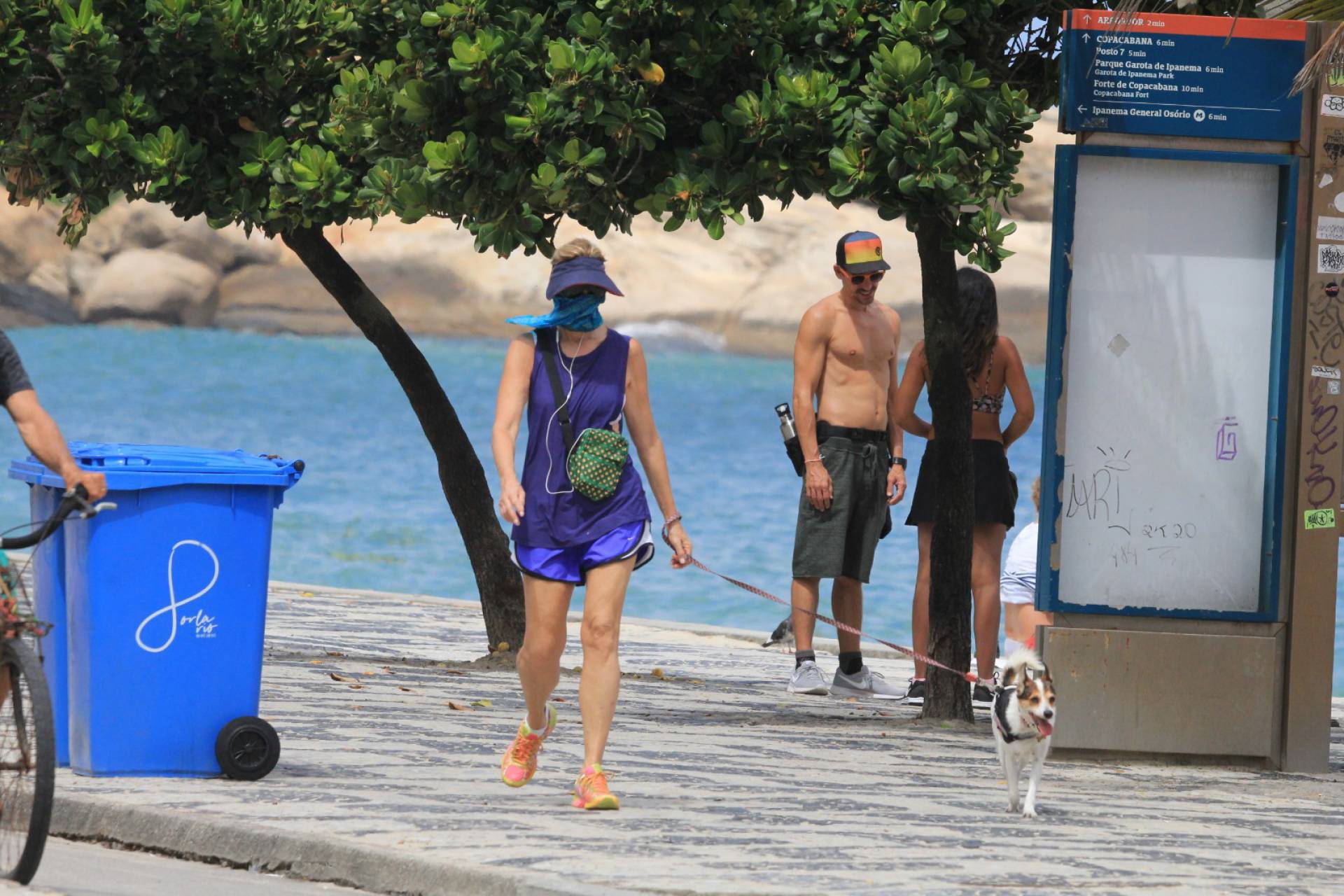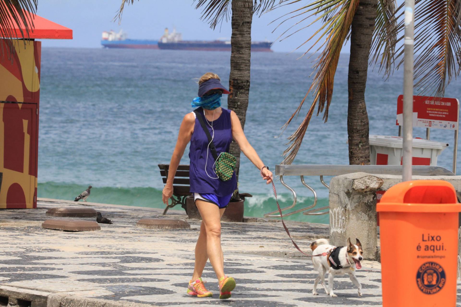 Atriz foi flagrada por paparazzo enquanto levava seu cachorrinho para passear pela orla de Ipanema, na Zona Sul da capital.